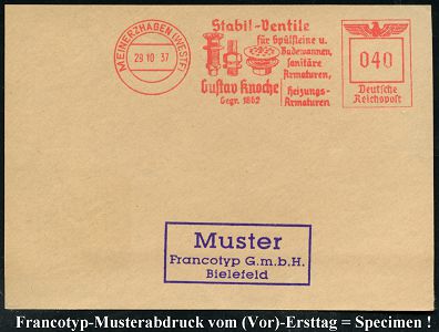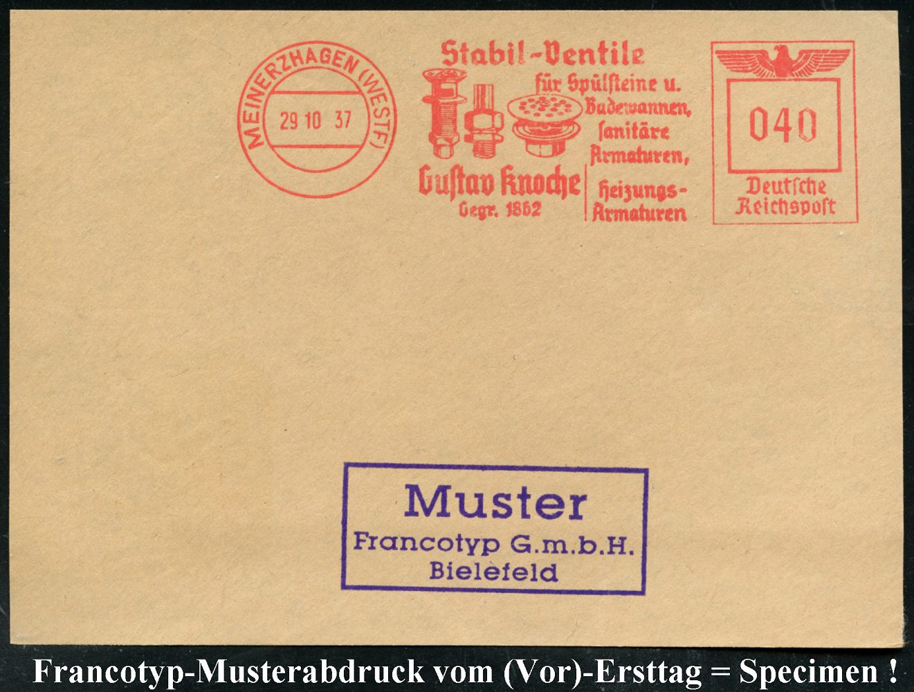10900 | 35 € | PL-Raum 58 : MEINERZHAGEN (WESTF)/ Stabil-Ventile/ für Spülsteine u./ Badewannen,/ sanitäre/ Armaturen/ Gustav Knoche.. 1937 (29.10.) AFS-Musterabdrucj Francotyp "Reichsadler" (Motive: Spüleinsätze) glasklar gest. Francotyp-Musterblatt vom (Vor)-Ersttag ! selten u. seltene Motive! (Dü.E-5CGo) | ![]() ![]() | |