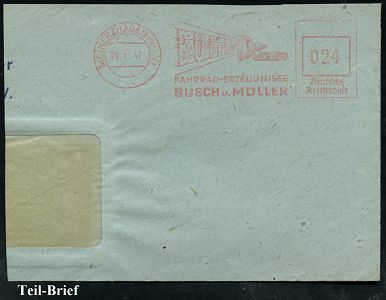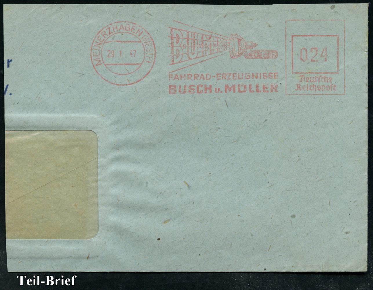 10901 | 18 € | PL-Raum 58 : MEINERZHAGEN (WESTF)/ B-U-M-M/ FAHRRAD-ERZEUGNISSE/ BUSCH u.MÜLLER 1947 (29.1.) aptierter AFS Francotyp "Reichsadler" = entfernt = Notmaßnahme! (Motiv: strahlende Fahrrad-Lampe) Teil-Bf. (Dü.E-13 J-129o) | ![]() | |