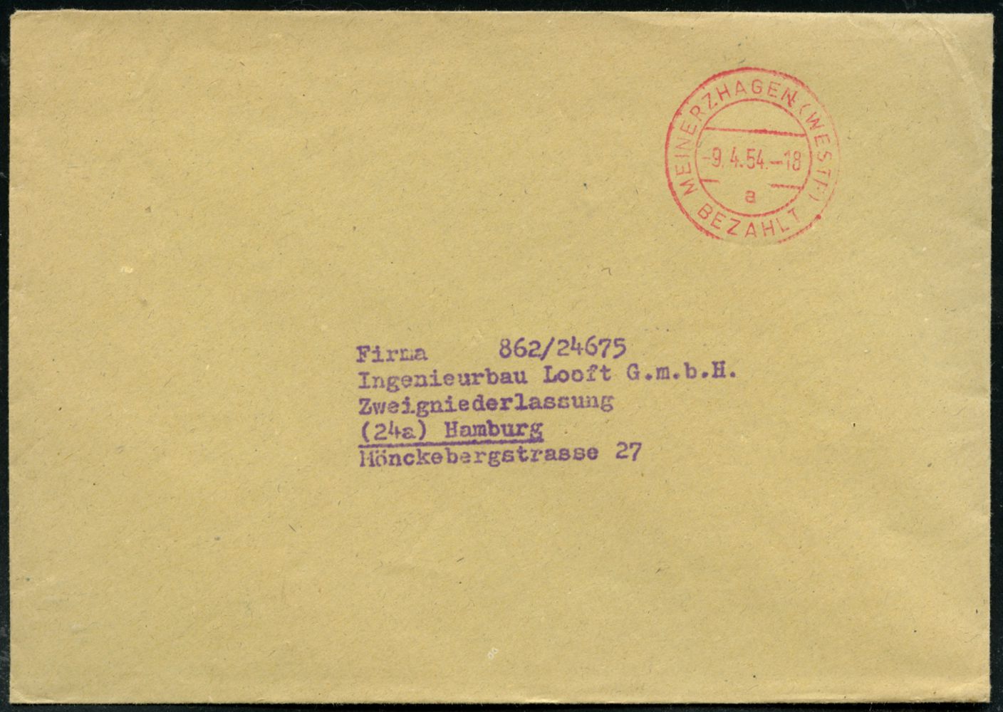 10902 | 10 € | PL-Raum 58 : MEINERZHAGEN (WESTF)/ a/ BEZAHLT 1954 (9.4.) 2K-Steg-PFS ohne PLZ mit Uhrzeit , klar gest. Inl.-Bf. (Dü.A-7, Nr.32) | ![]() | |