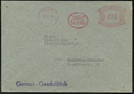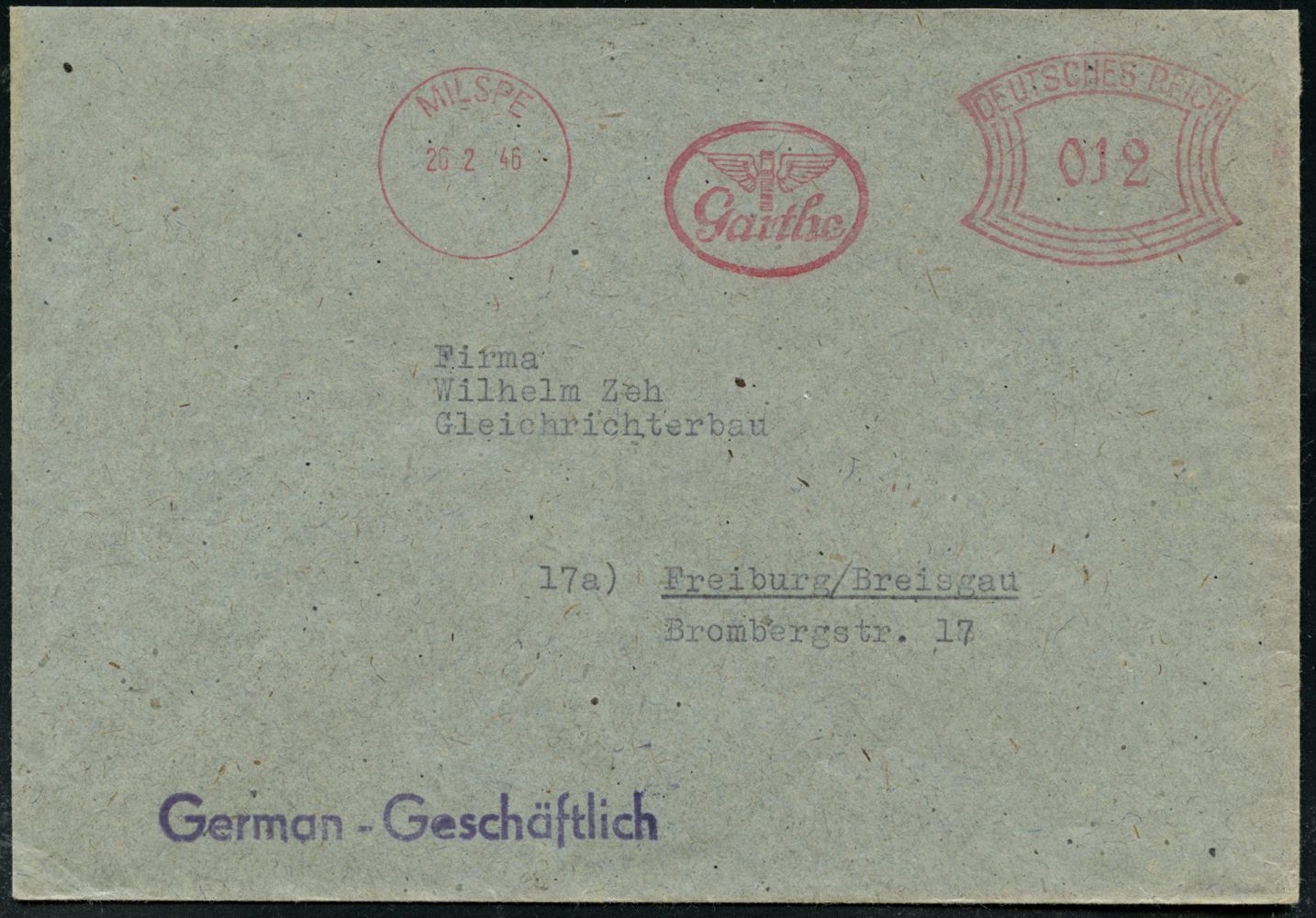 10903 | 25 € | PL-Raum 58 : MILSPE/ Garthe 1946 (26.2.) AFS Francotyp "Bogenrechteck" u nv e r ä n d e r t weiterverwendet mit Inschrift "DEUTSCHES REICH" = Notmaßnahme! (Firmen-Logo: geflügeltes Eisenrad, Fern-Bf. (Dü.E-1CEo, unverändert !) | ![]() | |