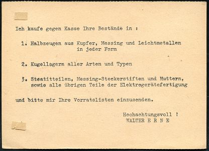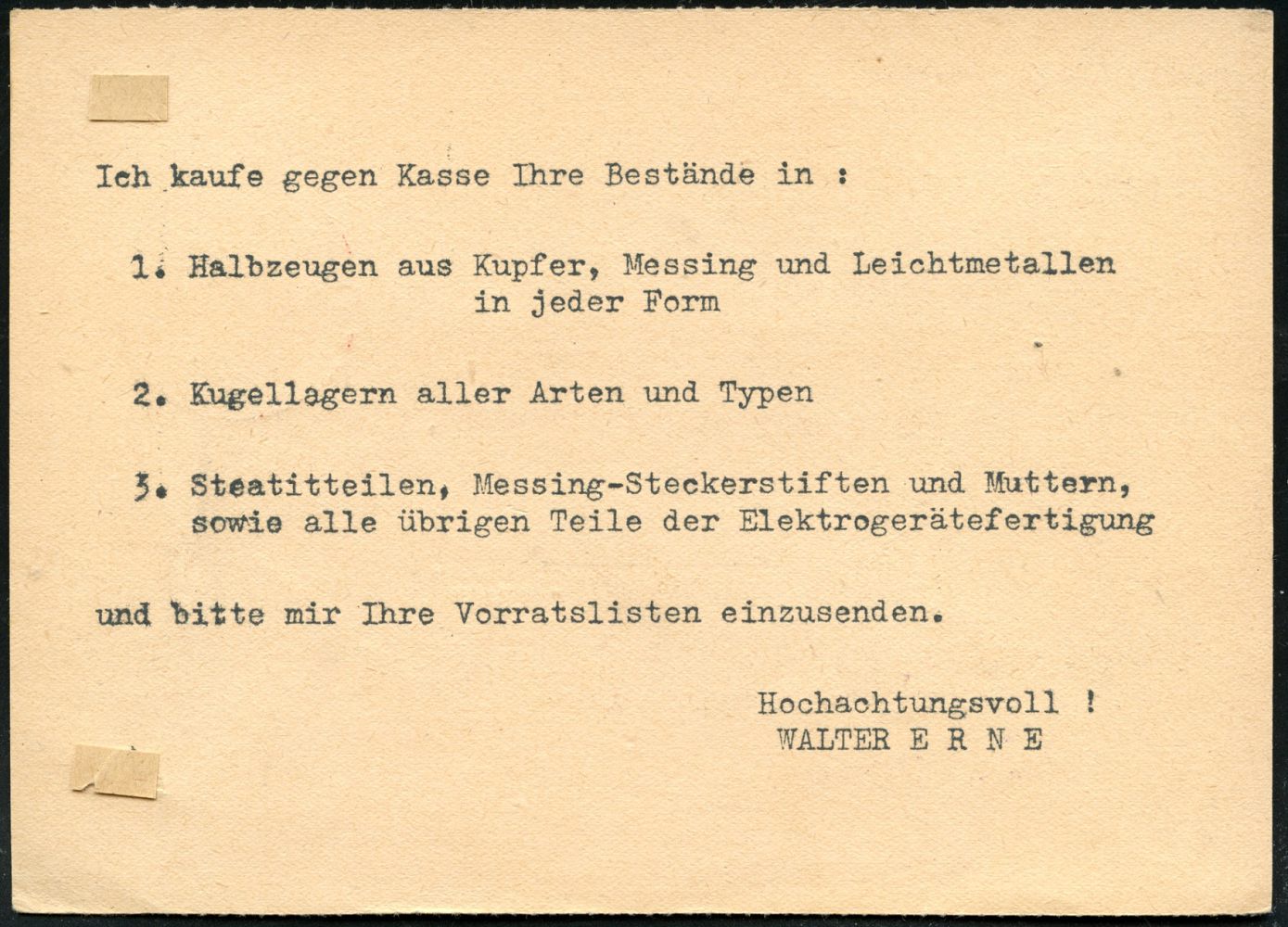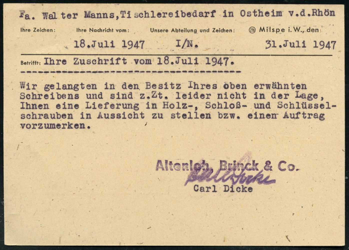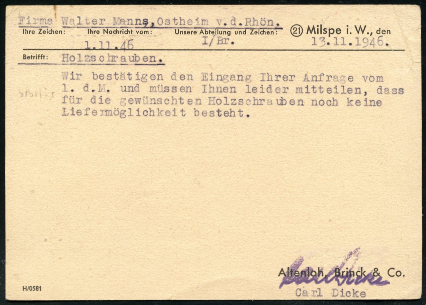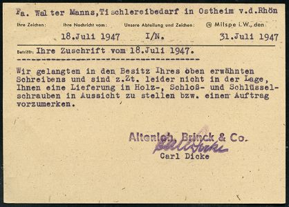 10904 | 25 € | PL-Raum 58 : MILSPE/ Die guten ABC Schrauben 1946 (13.11.) aptierter AFS Francotyp "Reichsadler" = entfernt = Notmaßnahme! (Monogr.-Logo mit 3 Schrauben) motivgl. Firmen-Kt. mit Text über Materialmangel, vergl. Kat.-Nr. 10906 (Dü.E-13 J-129o) | ![]() ![]() | |