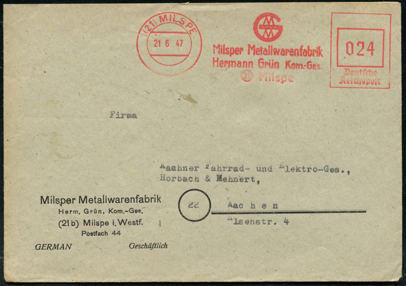 10905 | 25 € | PL-Raum 58 : (21) MILSPE/ MMG/ Milsper Metallwarenfabrik/ Hermann Grün.. 1947 (21.6.) aptierter AFS Francotyp "Reichsadler" = entfernt = Notmaßnahme! (Monogr.-Logo) Firmen-Fern-Bf. (Dü.E-13 J-129o) | ![]() | |