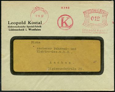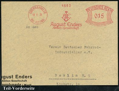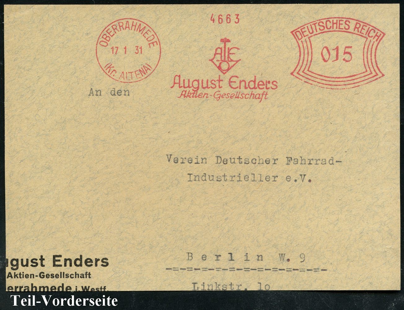 10909 | 14 € | PL-Raum 58 : OBERRAHMEDE/ (Kr.ALTENA)/ A E/ August Enders/ AG 1931 (17.1.) AFS Francotyp "Bogenrechteck" (Monogr.-Logo mit Hammer) klar gest. Teil-Vorderseite (Dü.E-1CEh) | ![]() | |