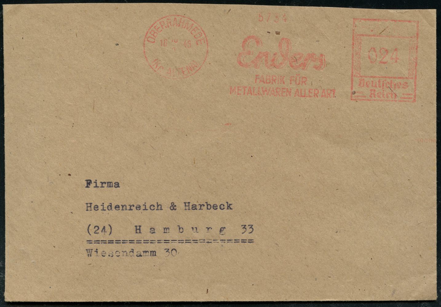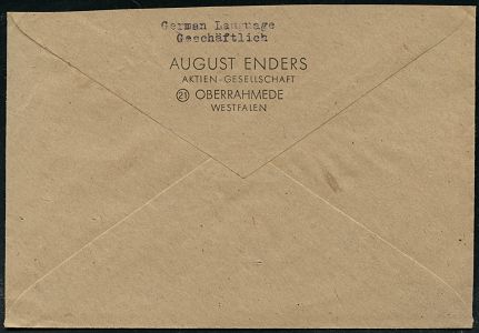10914 | 30 € | PL-Raum 58 : OBERRAHMEDE/ (Kr.ALTENA)/ Enders/ FABRIK FÜR/ METALLWAREN ALLER ART 1946 (16.10.) seltener, aptierter AFS Francotyp "Hakenkreuz" = entfernt = Notmaßname! , rs. Abs.-Vordruck: AUGUST ENDERS AG.., Fern-Bf., vergl. Kat.-Nr. 10911, 10915 (Dü.E-12 K-97h) | ![]() ![]() | |