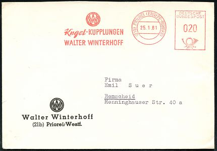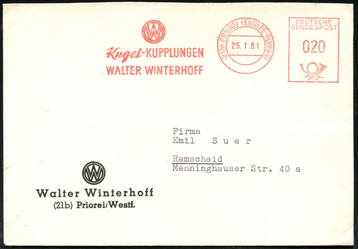 10917 | 15 € | PL-Raum 58 : (21b) PRIOREI (ENNEPE-RUHRKR)/ WW/ Kugel-KUPPLUNGEN/ WALTER WINTERHOFF 1961 (25.1.) AFS Francotyp (Monogr.-Logo) motivgl. Firmen-Bf. (Dü.E-26 alte PLZ) | ![]() | |