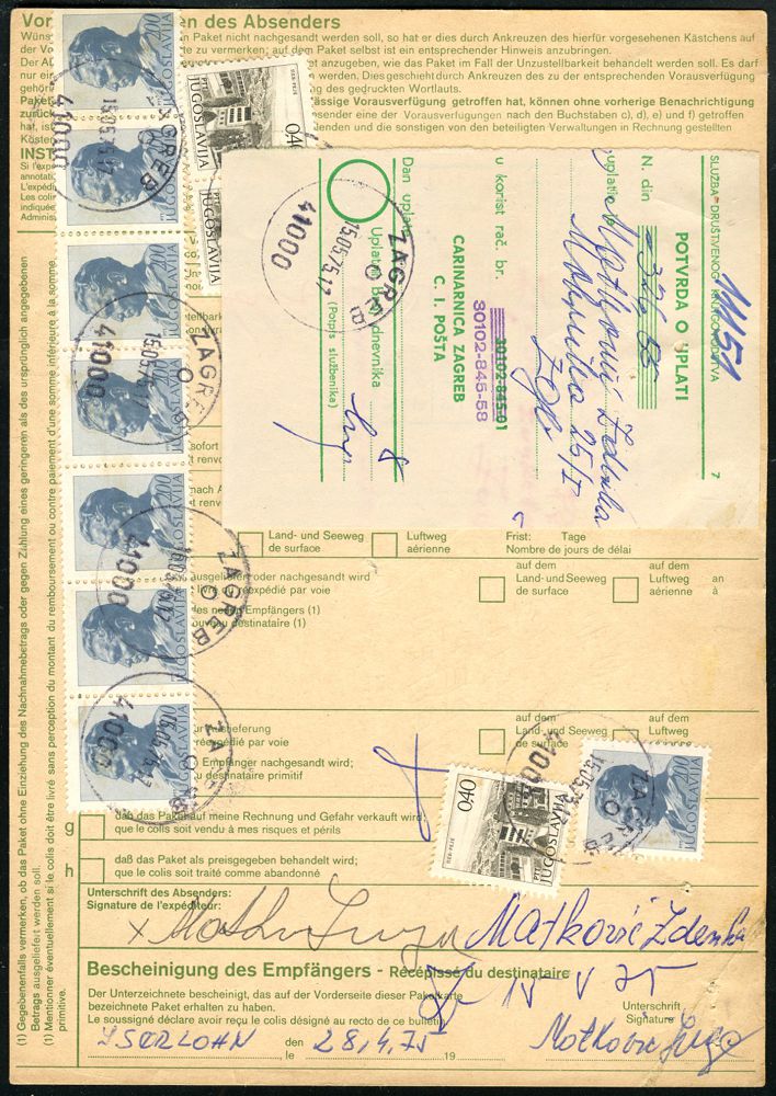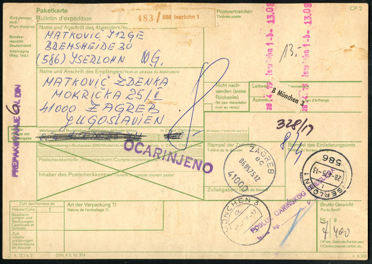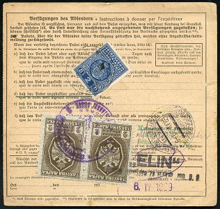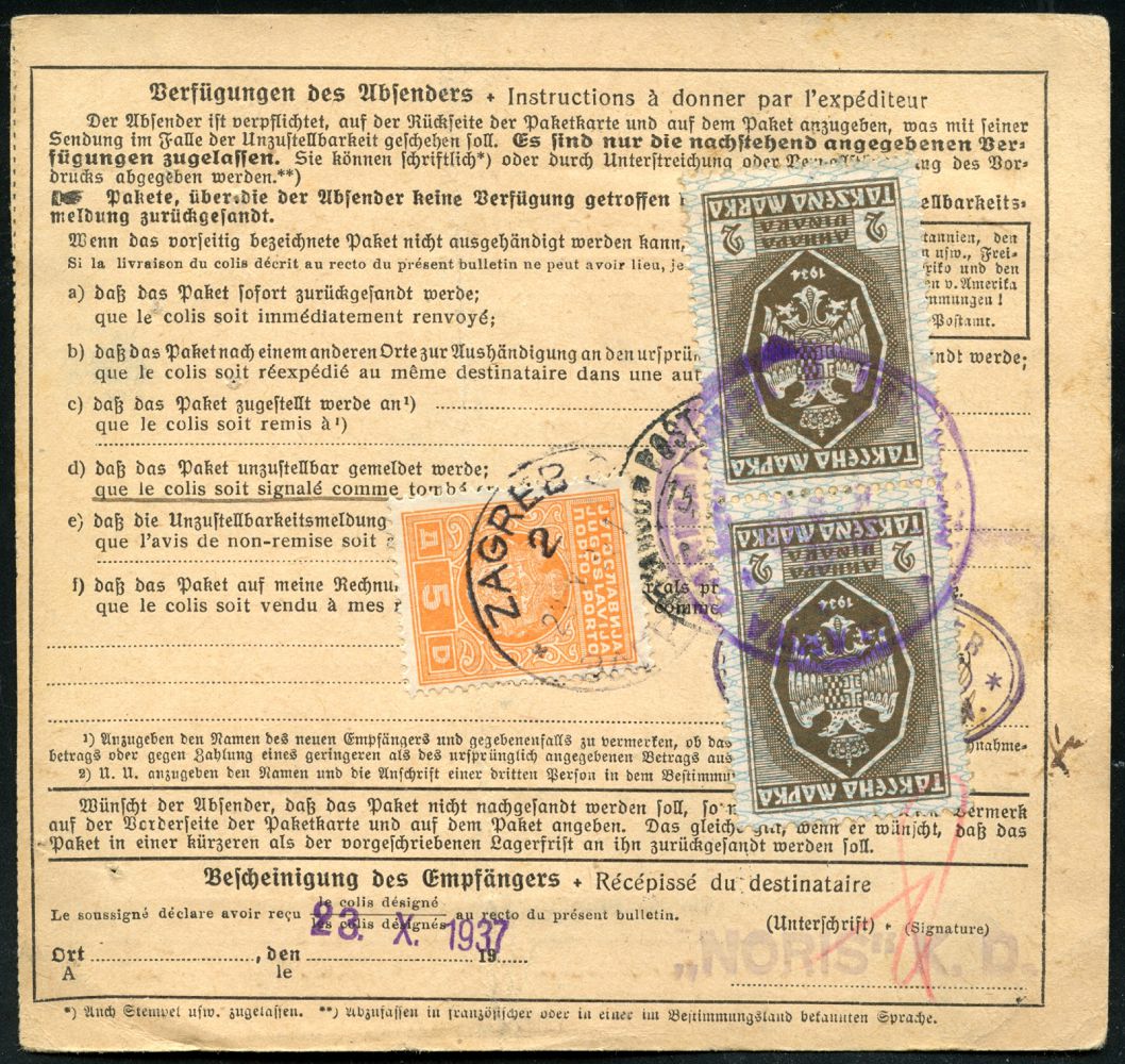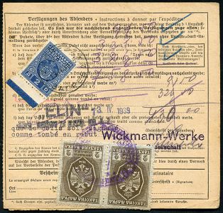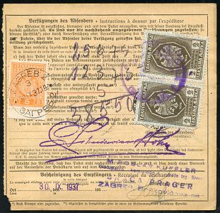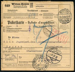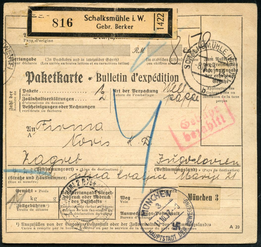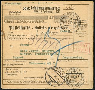 10918 | 22 € | PL-Raum 58 : SCHALKSMÜHLE (WESTF)/ b 1937 (8.10.) 2K-Steg + roter Ra.2: Gebühr/ bezahlt + alter Selbstbucher-Paketzettel: Schalksmühke i. W. / Gebr. Berker (gelb/ schwarz) + 1K u. Leitzettel: München 3 etc., Ausl.-Selbstbucher-Paketkarte (Mittelfalte) n. Zagreb, rs. jugoslaw. Tax- u. Fiskalmarken! | ![]() ![]() | |