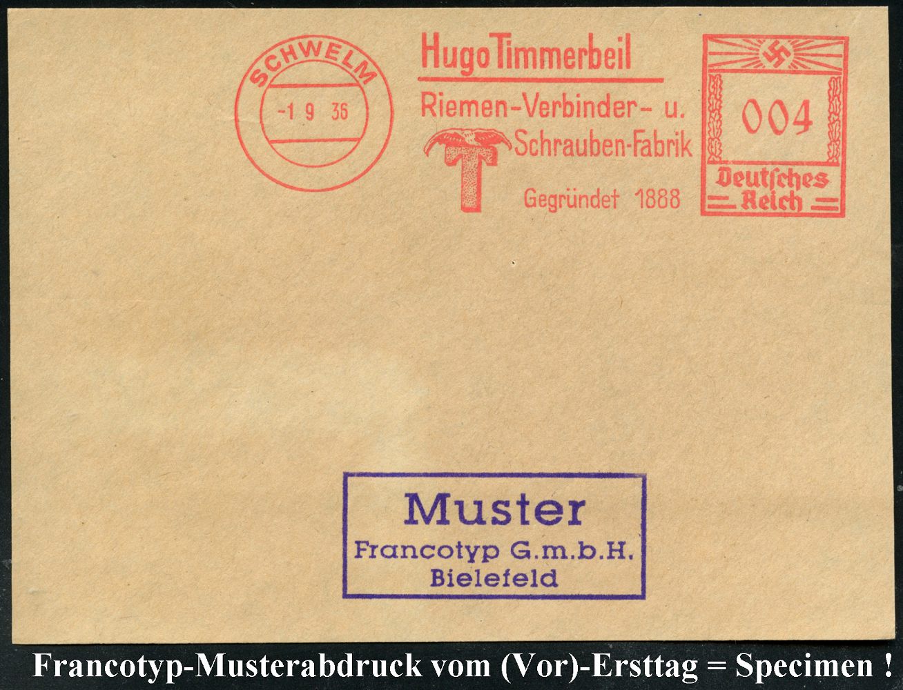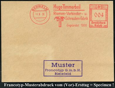 10926 | 35 € | PL-Raum 58 : SCHWELM/ Hugo Timmerbeil/ Riemen-Verbinder-u./ Schrauben-Fabrik.. 1936 (1.9.) AFS-Musterabdruck Francotyp "Hakenkreuz" (Monogr.-Logo) glasklar gest. Francotyp-Musterblatt vom (Vor)-Ersttag !, selten! (Dü.E-3CEo) | ![]() ![]() | |