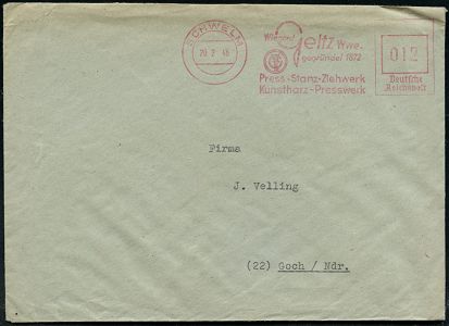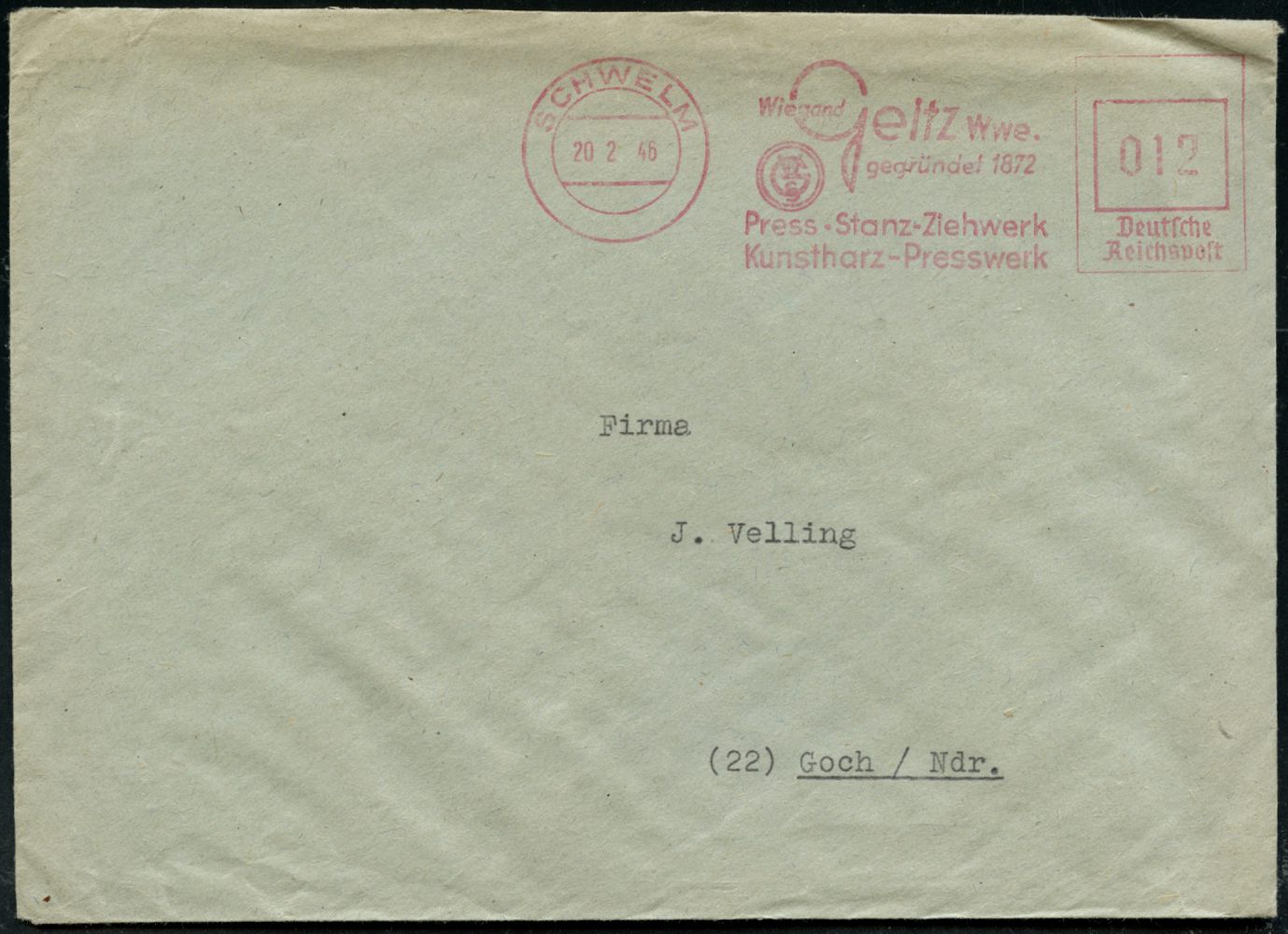 10933 | 22 € | PL-Raum 58 : SCHWELM/ Wiegand Geitz Wwe./ ..Press-Stanz-Ziehwerk/ Kunstharz-Presswerk 1946 (20.2.) aptierter AFS Francotyp "Reichsadler" = entfern = Notmaßnahme! (Firmen-Logo) Fern-Bf. (rs. Klappenriß) rs. ovaler Abs.-HdN (Dü.E-13 J-129o) | ![]() | |