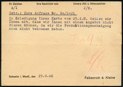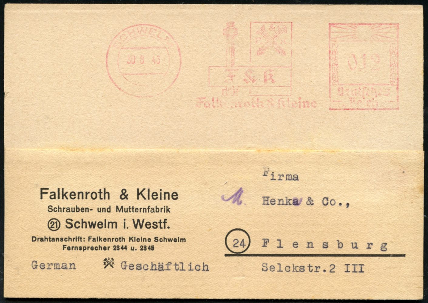 10934 | 35 € | PL-Raum 58 : SCHWELM/ F & K/ Falkenroth & Kleine.. 1946 (30.8.) seltener, aptierter AFS Francotyp "Hakenkreuz" (Schrauben-Logo, Schraube mit Mutter) Firmen-Kt. mit rs. Text über Fehlen von Produktions-Genehmigung !, vergl. Kat.-Nr. 10925 (Dü.E-12 D-98o = seltene Type, Dürst-Eich unbekannt!) | ![]() ![]() | |