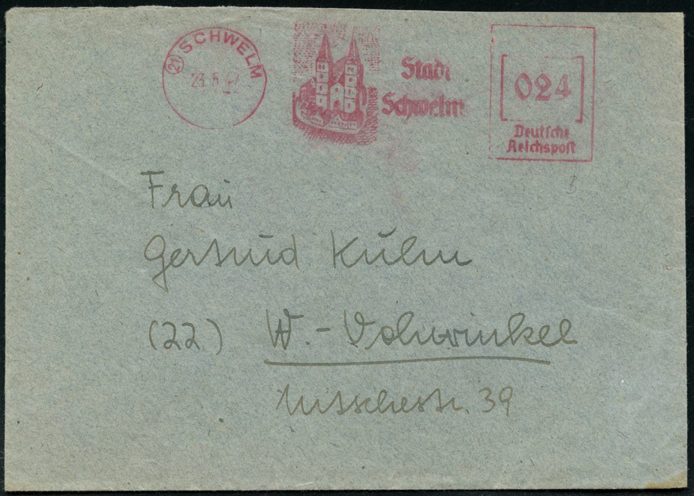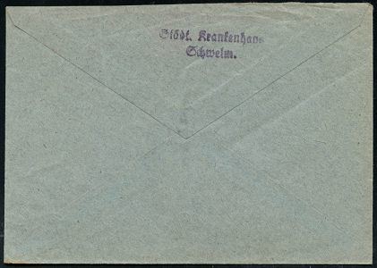 10935 | 23 € | PL-Raum 58 : SCHWELM/ Stadt Schwelm 1947 (23.5.) aptierter AFS Francotyp "Reichsadler" = entfernt = Notmaßnahme! (Christus-Kirche) rs. Abs.-2L: Städt. Krankenhaus/ Schwelm, Fern-Bf. (Dü.E-13 J-122o) | ![]() ![]() | |
