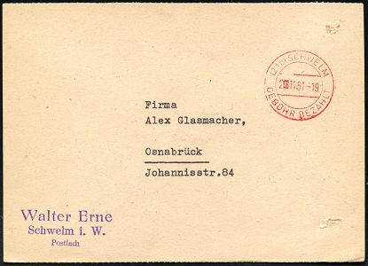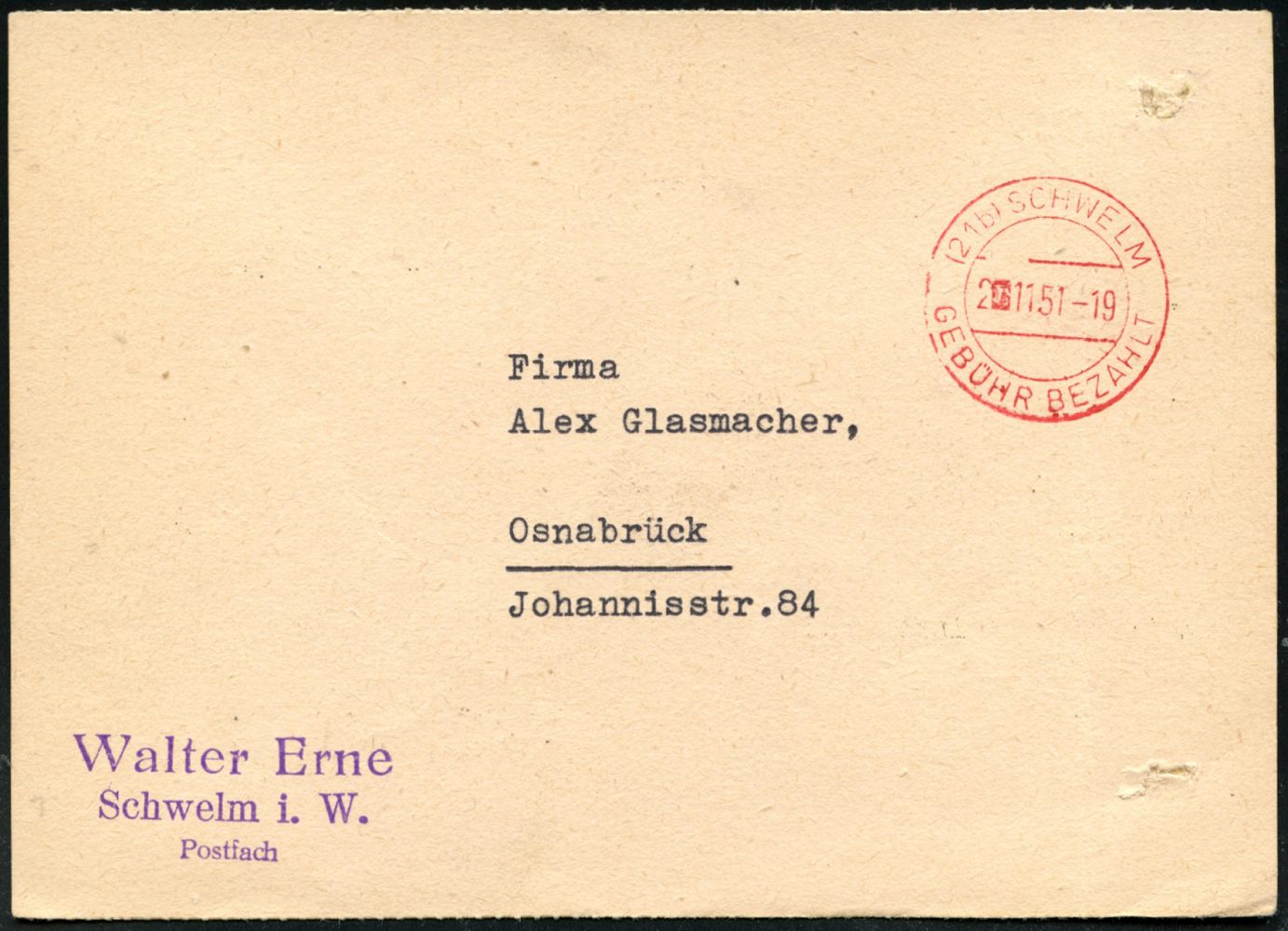 10939 | 10 € | PL-Raum 58 : (21b) SCHWELM/ GEBÜHR BEZAHLT 1951 (20.11.) 2K-PFS (1 Tag im Datum geblockt) mit Uhrzeit , Firmen-Kt.: Walter Erne mit Ankaufsanfragen von Metallen (rechts Heftklammerspuren) n. Osnabrück (Dü.A-7, Nr.28) | ![]() ![]() | |