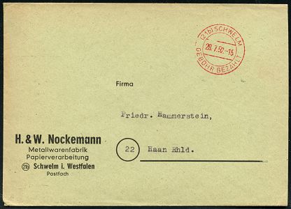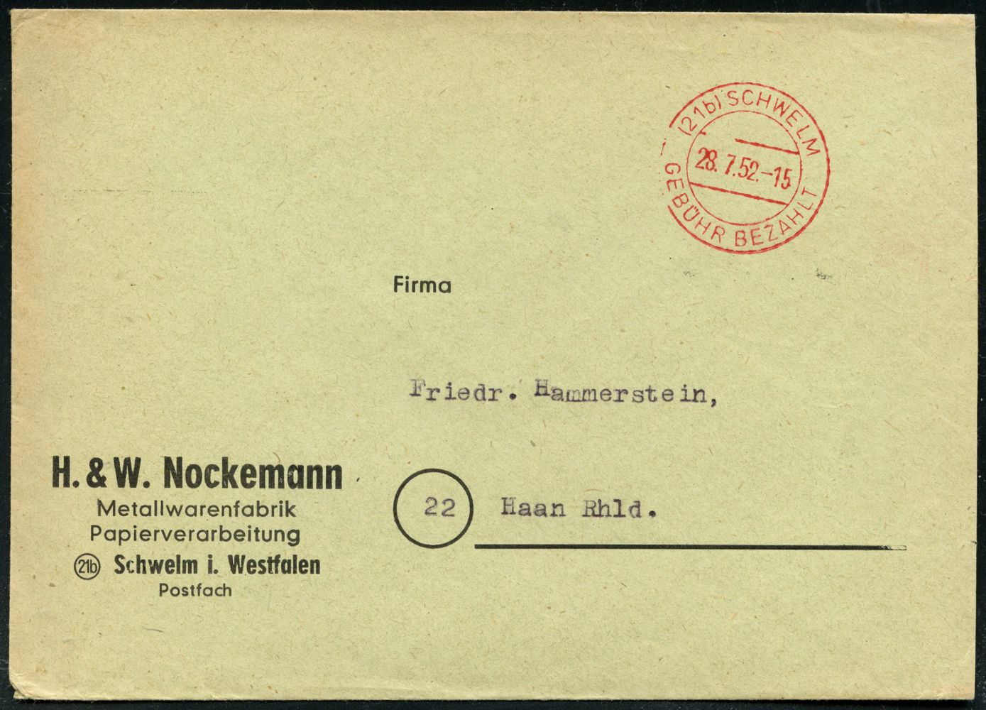 10940 | 8 € | PL-Raum 58 : (21b) SCHWELM/ GEBÜHR BEZAHLT 1952 (28.7.) 2K-PFS mit Uhrzeit auf Firmen-Bf.: H. & W. Nockemann, Metallwarenfabrik, Papierverarbeitung.. (Dü.A-7, Nr.28) | ![]() | |
