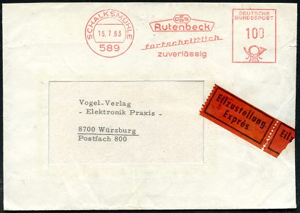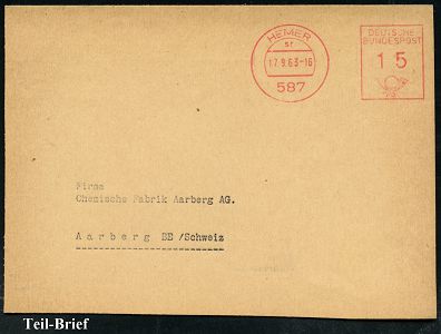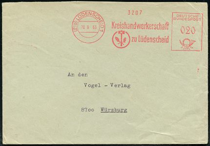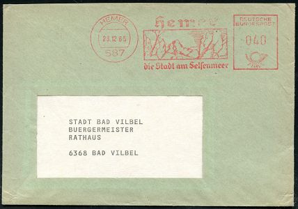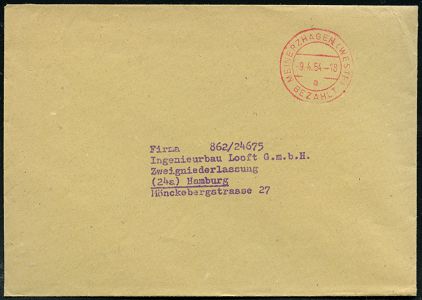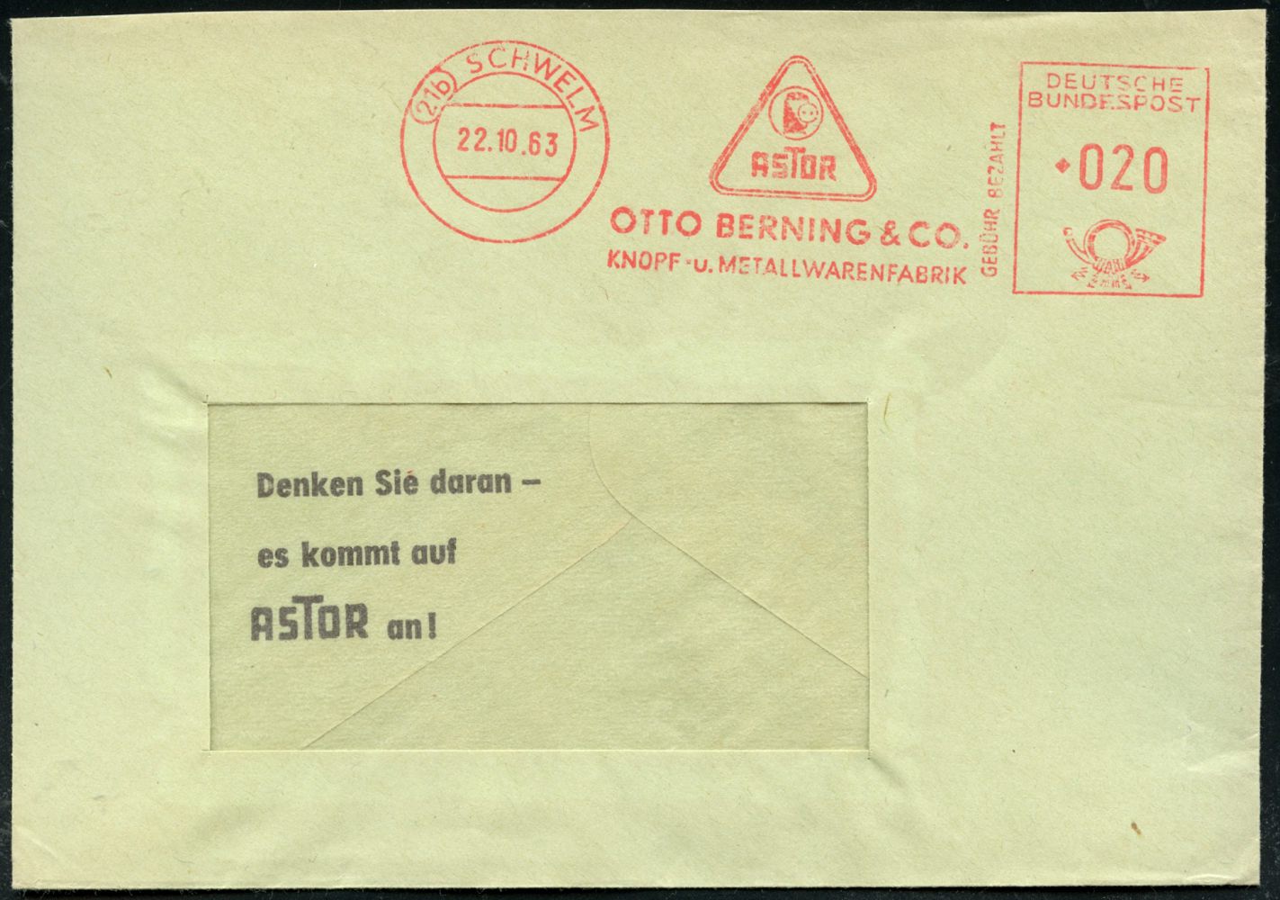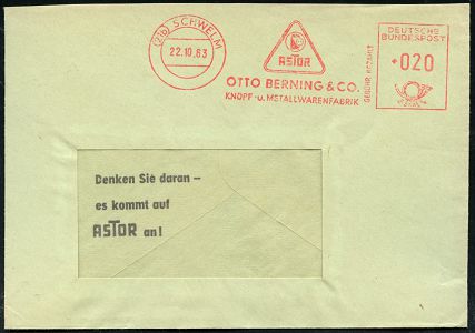 10941 | 10 € | PL-Raum 58 : (21b) SCHWELM/ ASTOR/ OTTO BERNING & CO/ KNOPF-u.METALLWARENFABRIK/ GEBÜHR BEZAHLT 1963 (22.10.) AFS Francotyp 020 Pf. (Firmen-Logo) rs. Abs.-Vordruck, Fern-Bf. = Spätverwendung alte PLGZ (Dü.E-23CO) | ![]() | |