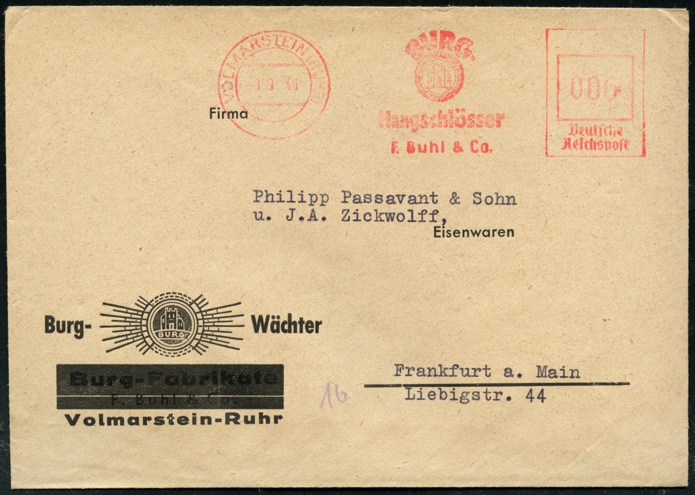 10951 | 25 € | PL-Raum 58 : VOLMARSTEIN (RUHR)/ BURG-/ Hangschlösser/ F.Buhl & Co. 1946 (9.9.) aptierter AFS Francotyp "Reichsadler" = entfernt = Notmaßnahme! (Firmenlogo: Burg) motivgl., überdruckter Firmen-Fern-Bf. (Dü.E-13 J-129o) | ![]() | |