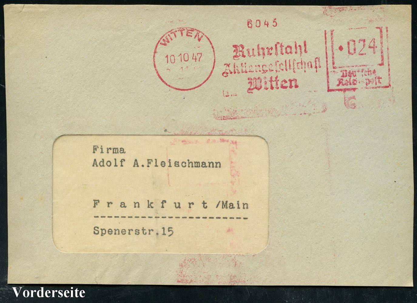 10972 | 18 € | PL-Raum 58 : WITTEN/ Ruhrstahl/ AG/ Witten 1947 (10.10.) aptierter AFS Francotyp "Reichsadler" = entfernt = Notmaßnahme! , Bedarfs-Vorderseite (Dü.E-13 R-147h = seltene Type!) | ![]() | |