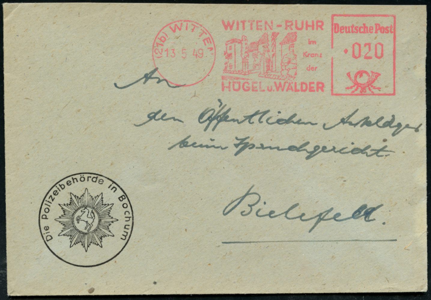 10973 | 15 € | PL-Raum 58 : (21b) WITTEN/ WITTEN-RUHT/ im/ Kranz/ der/ HÜGEL u.WÄDER 1949 (13.5.) AFS Francotyp "Posthorn" (Häuser) auf Polizei-Dienst-Bf. (rs. kl. Kerbe geschl.) rs. Abs.-2L: Die Polizeibehörde in Bochum/ Polizeiabschnitt hs. Zusatz "Witten.." (Dü.E-20DGo) | ![]() ![]() | |