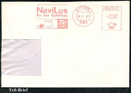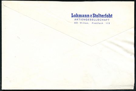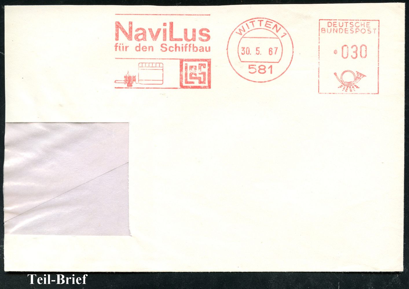 10975 | 12 € | PL-Raum 58 : 581 WITTEN 1/ NaviLus/ für den Schiffbau/ L & S 1967 (30.5.) AFS Francotyp (Schiffsantrieb u. Monogr.-Logo) rs. Abs.-Vordruck: Lohmann & Stolterfoth AG.., Teil-Bf. (Dü.E-26) | ![]() ![]() | |