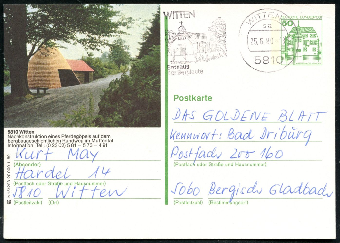 10976 | 14 € | PL-Raum 58 : 5810 WITTEN 1/ sa/ Bethaus/ der Bergleute 1980 (25.6.) MWSt = Kirche auf ortsgleicher BiP 50 Pf. Burgen, grün: 5810 Witten.. Pferdegöpel auf dem bergbaugeschichtl. Rundweg im Muttetal.. (Mi.P 130/h 15-228) Bedarfs-Kt.!, seltene Kombination! | ![]() | |