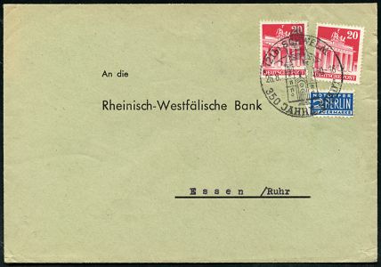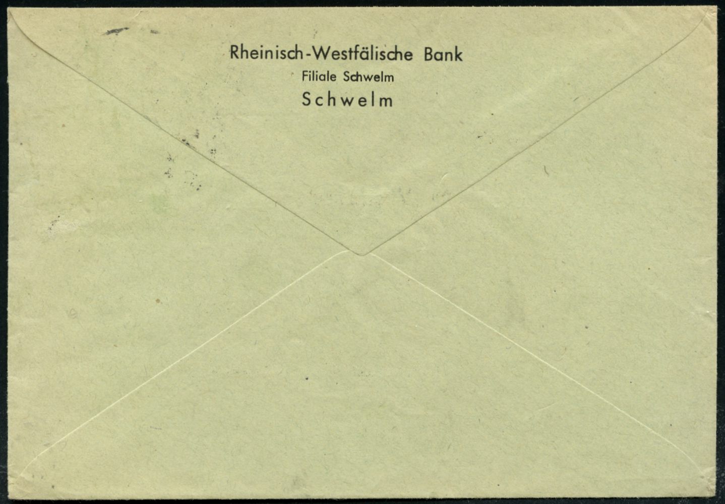 10938 | 15 € | PL-Raum 58 : (21b) SCHWELM/ 350 JAHRE STADT 1950 (26.8.) HWSt (Christuskirche) auf 2x 20 Pf. Bauten eng. gez. (Mi.85 eg, MeF) + 2 Pf. NoB, rs. Abs.: Rhein.-Westfäl. Bank, Fern-Doppel-Bf. (Bo.2 , nur 1950 verwendet!) | ![]() ![]() | |