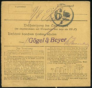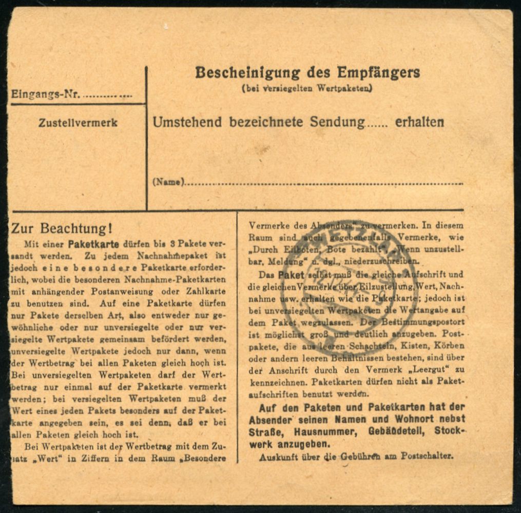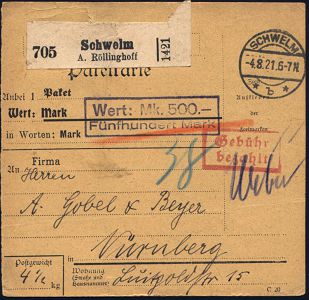 10924 | 20 € | PL-Raum 58 : SCHWELM/ *b* 1921 (4.8.) 1K-Brücke + roter Ra.2: Gebühr/bezahlt + schw. Selbstbucher-Paketzettel: Schwelm/ A. Röllinghoff (= Bänder- u. Litzen-Fabrik) + viol. Ra.: Wert: Mk. 500.-..., klar gest. Infla- Inl.-Selbstbucher-Wertpaket-Kt. (kl. Riß geschl.) rs. AS. (vergl. Kat.-Nr. 10930) | ![]() ![]() | |