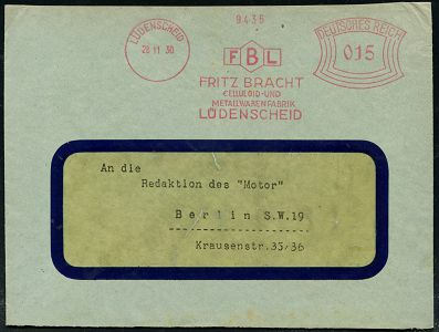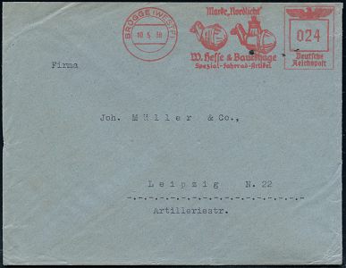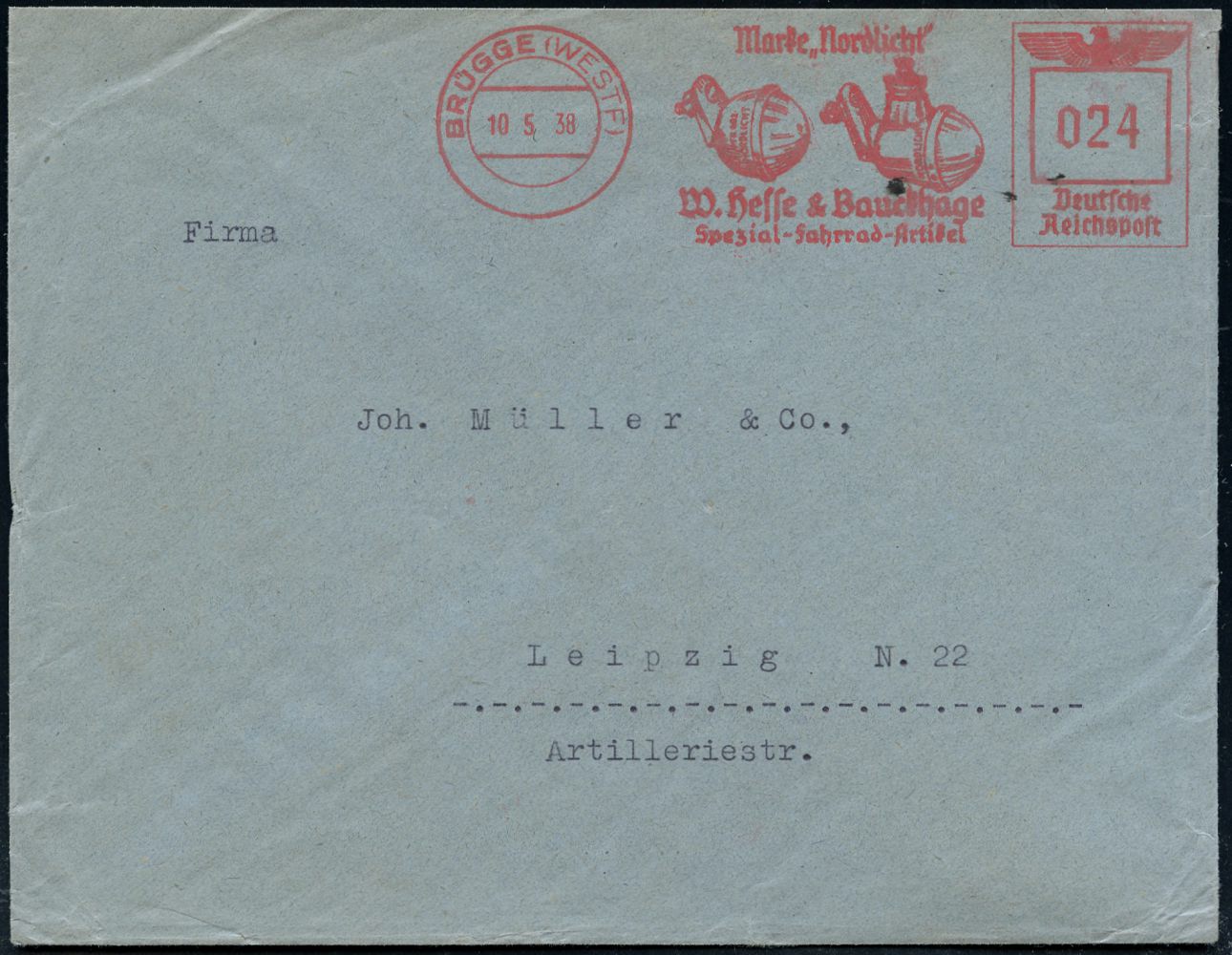 10749 | 25 € | PL-Raum 58 : BRÜGGE (WESTF)/ Marke "Nordlicht"/ W.Hesse & Bauckhage/ Spezial-Fahrrad-Artikel 1938 (10.5.) dekorativer AFS Francotyp "Reichsadler" = 2 Fahrrad-Dynamos , klar gest. Inl.-Bf., schöne u. ausgefallene Motive! (Dü.E-5CGo) | ![]() | |