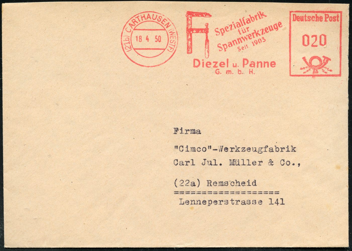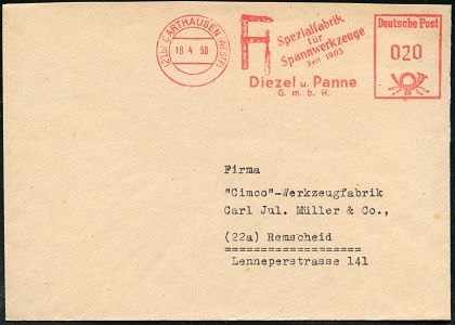 10752 | 15 € | PL-Raum 58 : (21b) CARTHAUSEN (WESTF)/ ..Spannwerkzeuge/ Seit 1903/ Diezel u.Panne/ GmbH 1950 (18.4.) AFS Francotyp "Posthorn" (Spannwerkzeug) klar gest. Inl.-Bf., schönes Motiv! (Dü.E-20CG) | ![]() | |