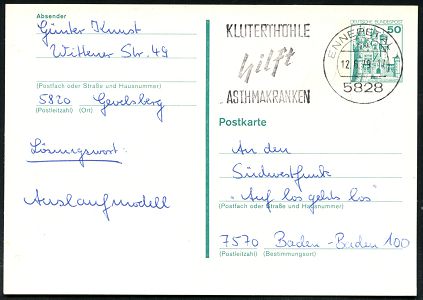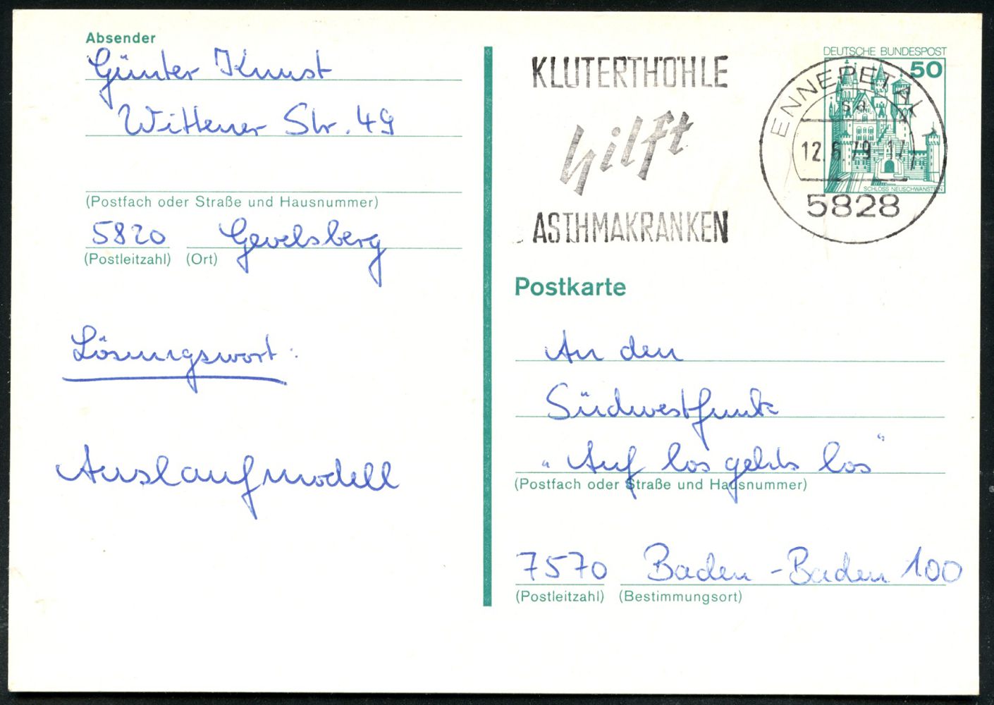 10760 | 6 € | PL-Raum 58 : 5828 ENNEPETAL 1/ sa/ KLUTERTHÖHLE/ hilft/ ASTHMAKRANKEN 1979 (12.6.) MWSt auf Bedarfs-Kt. | ![]() | |