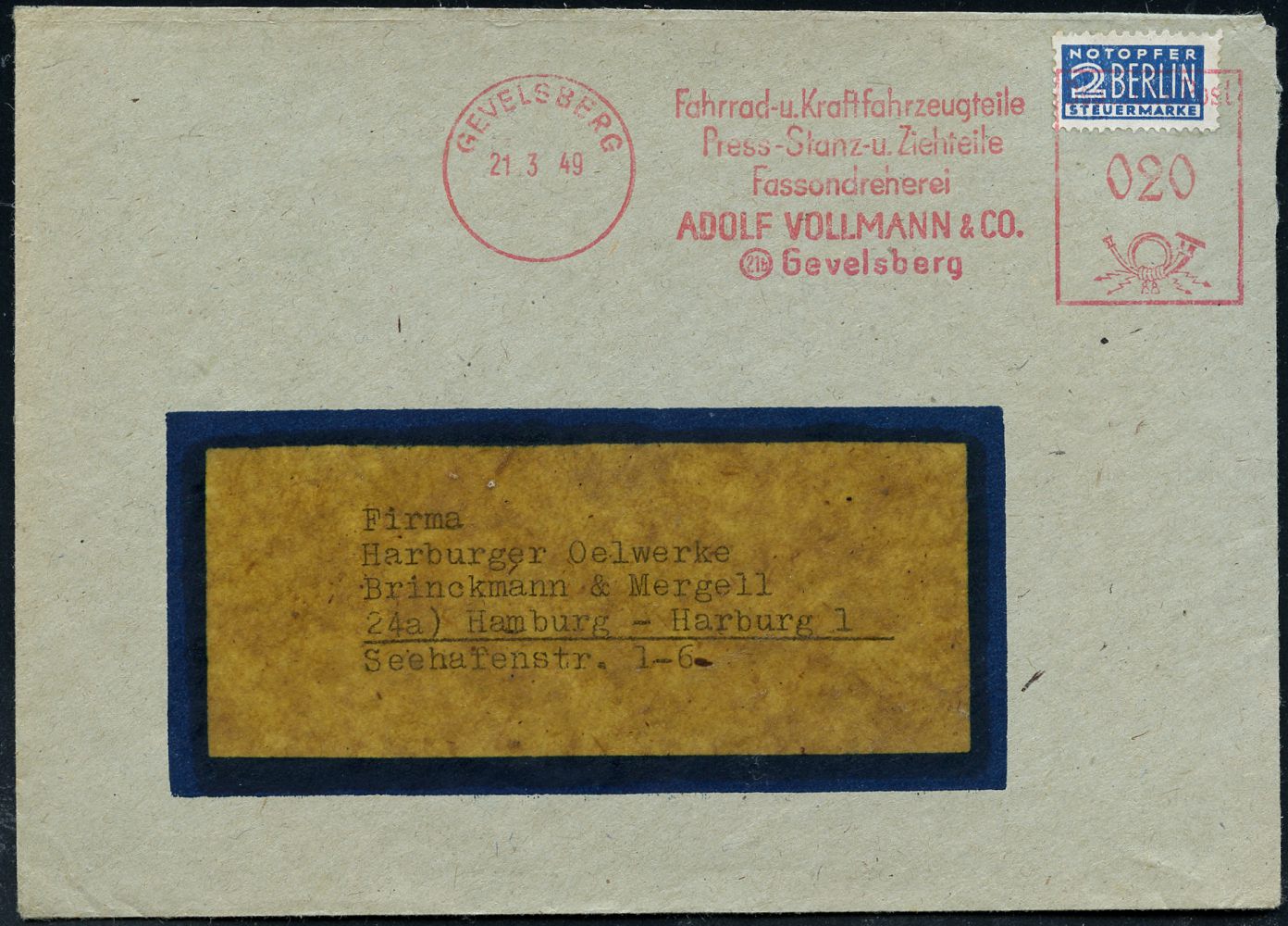 10771 | 16 € | PL-Raum 58 : GEVELSBERG/ Fahrrad-u.Kraftfahrzeugteile/ ..Fassondreherei/ ADOLF VOLLMANN & CO 1949 (21.3.) AFS Francotyp "Posthorn" auf 2 Pf. NoB (= Vorausentwertung) klar gest. Inl.-Bf., vergl. Kat.-Nr. 10766 (Dü.E-20CEo) | ![]() | |