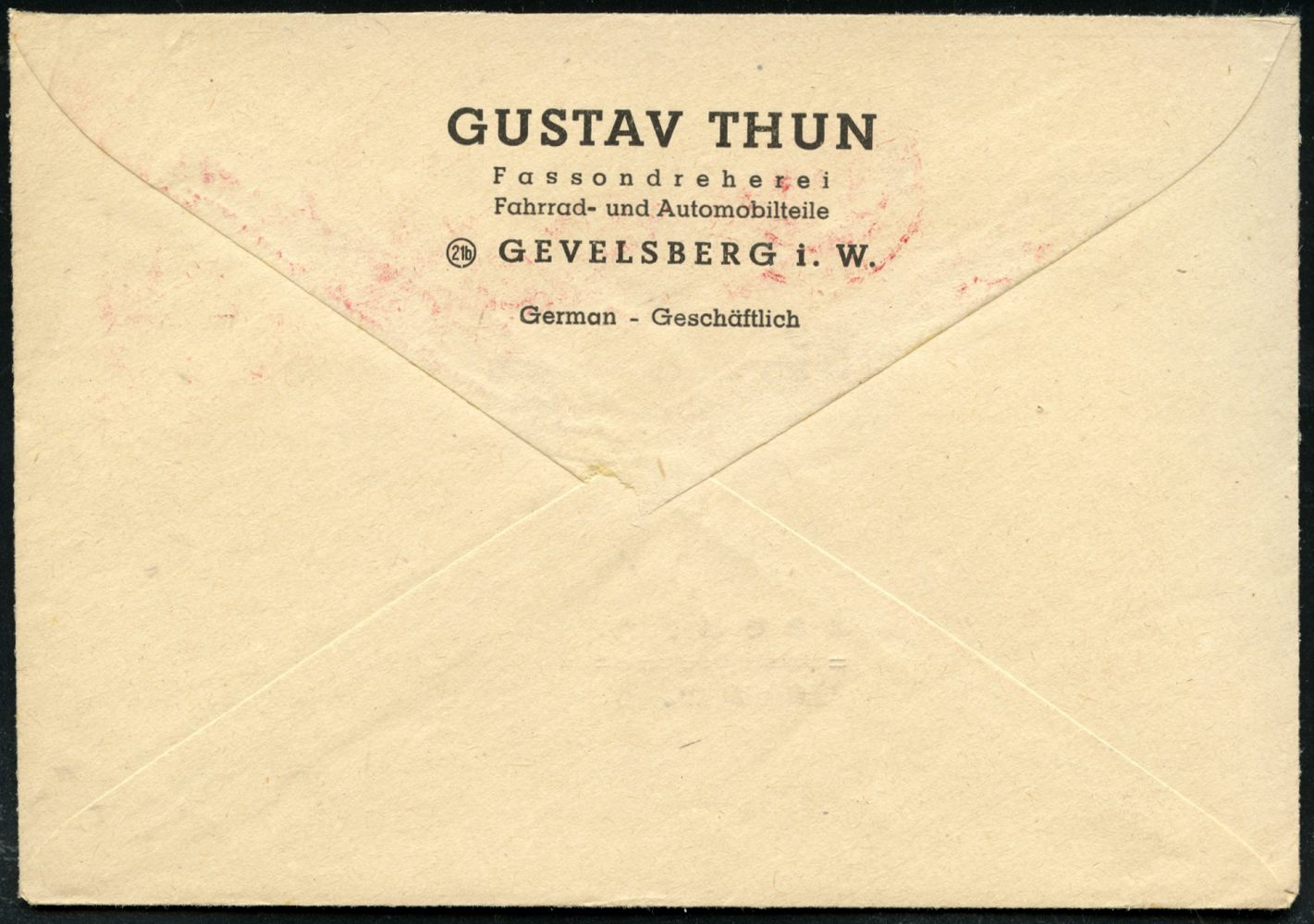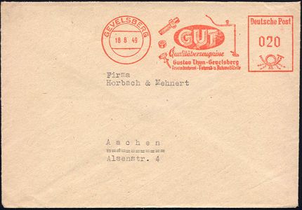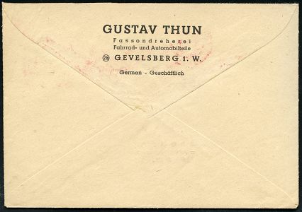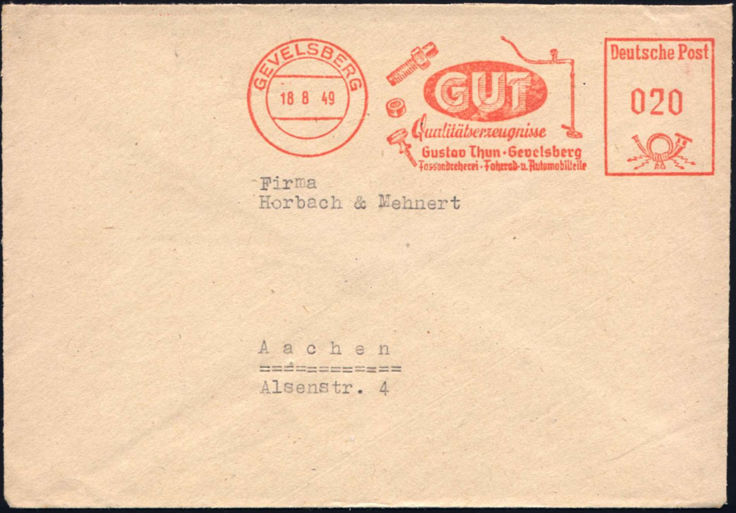 10772 | 18 € | PL-Raum 58 : GEVELSBERG/ Gustav Thun../ ..Fahrrad-u. Automobilteile 1949 (18.8.) AFS Francotyp "Posthorn" (= Schrauben, Muttern, Fahrrad-Pedal) rs. Abs.-Vordruck, klar gest. Inl.-Bf., seltene Motive! (Dü.E-20CGo) | ![]() ![]() | |