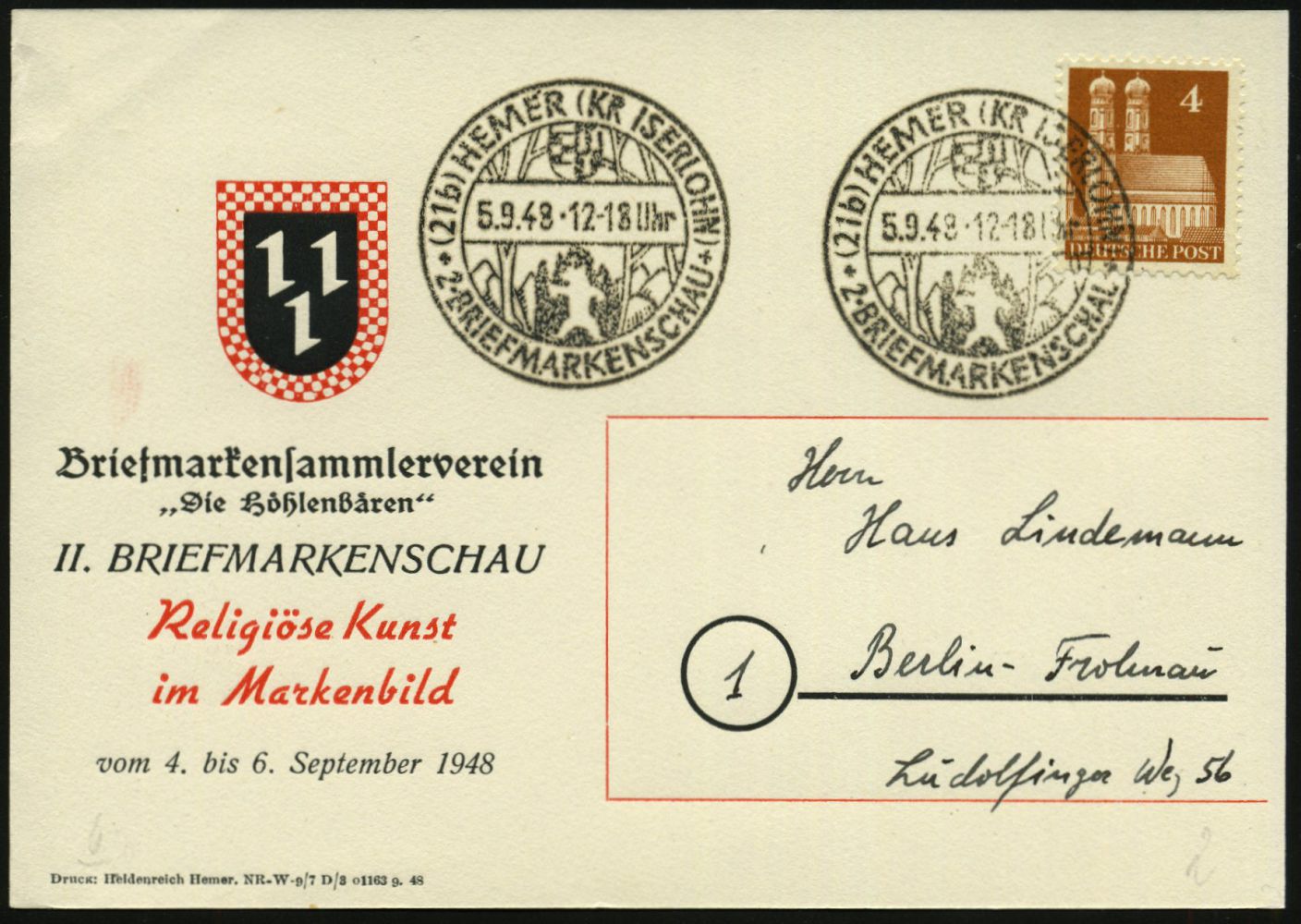 10788 | 20 € | PL-Raum 58 : (21b) HEMER (KR ISERLOHN)/ 2.BRIEFMARKENSCHAU 1948 (5.9.) SSt = Bär (im Hochwald) 2x klar auf zweifarbiger Ausstellungs.-Sonder-Kt. (Michealis Nr.1, + 30.- DM, 1991) Inl.-Kt. n. West-Berlin (Bo.2) | ![]() | |