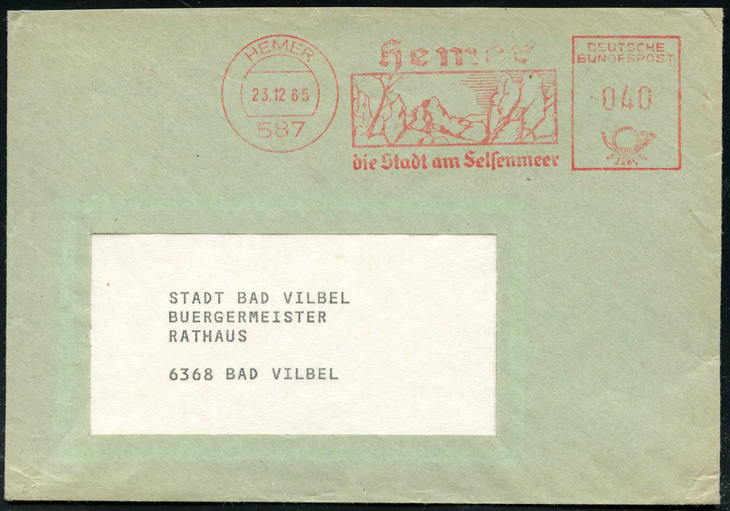 10789 | 18 € | PL-Raum 58 : (21b) #bzw# 587 HEMER/ Felsenmeer/ Amtskrankenhaus #bzw.# die Stadt am Felsenmeer 1961/65 2 verschiedene AFS Francotyp "Posthorn" (je Motiv: Felsenmeer) je auf Kommunal-Bf. (Einzelverkauf möglich: je 10.- EUR), 2 Belege (Dü.E-23CG, 23CO) | ![]() ![]() ![]() | |