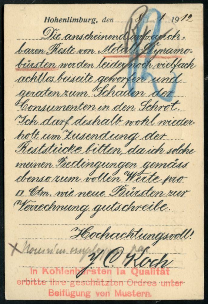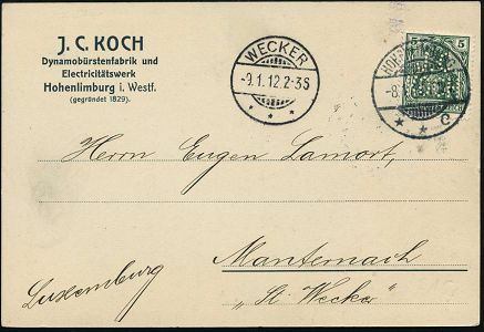 10799 | 20 € | PL-Raum 58 : HOHENLIMBURG/ **c 1912 (8.1.) 1K-Gitter auf EF 5 Pf. Germania mit Firmenlochung: "J. C. / KOCH" auf Reklame-Kt.: J. C. KOCH, Dynamobürstenfabrik u. Electricitätswerk, klar gest. Ausl.-Karte. n. Wecker, Luxembg. (vs. AS) (Mi.85 I, EF Perfin) | ![]() ![]() | |