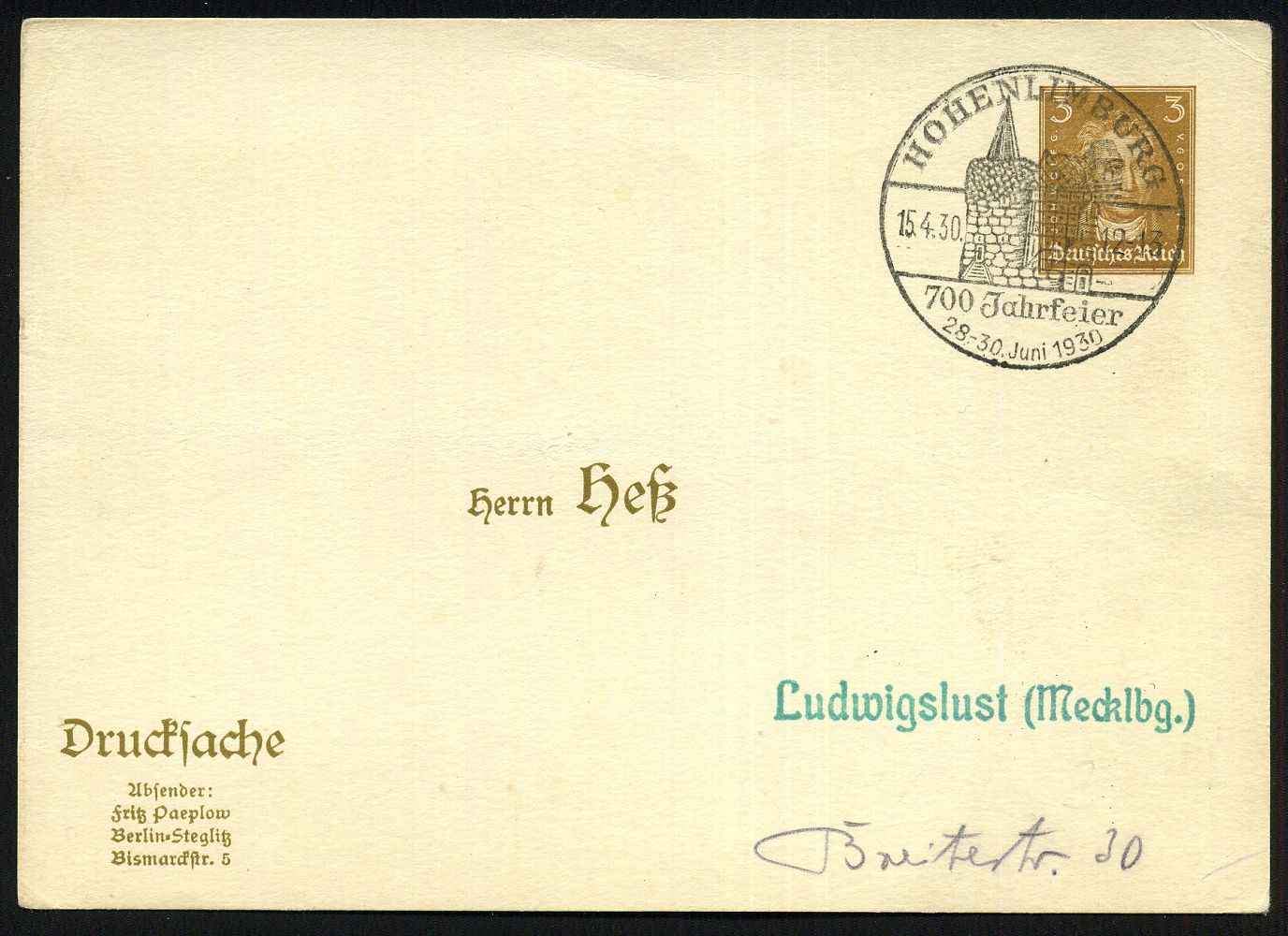 10800 | 20 € | PL-Raum 58 : HOHENLIMBURG/ 700 Jahrfeier/ 28.-30.Juni 1930 (15.4.) HWSt = Festungsturm (mit Stadtmauer) auf PP 3 Pf. Goethe, braun (Mi.PP 97/B 6-027 = Heß) klar gest. Inl.-Karte (Bo.3 , nur 1930 verwendet!) | ![]() | |