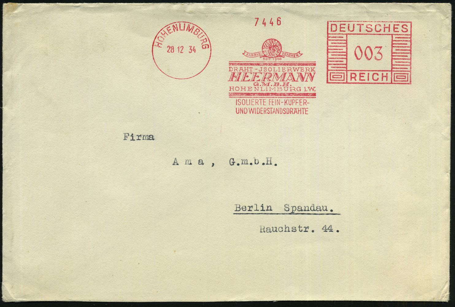 10801 | 25 € | PL-Raum 58 : HOHENLIMBURG/ DRAHT-JSOLIERWERK/ HERMANN/ GMBH/ ISOLIERTE FEIN-KUPFER-/ U.WIDERSTANDS-DRÄHTE 1934 (28.12.) dekorativer AFS Francotyp "Mäanderrechteck" = Spinne mit Netz , klar gest. Inl.-Bf., schönes u. seltenes Motiv! (Dü.E-2CEh) | ![]() | |