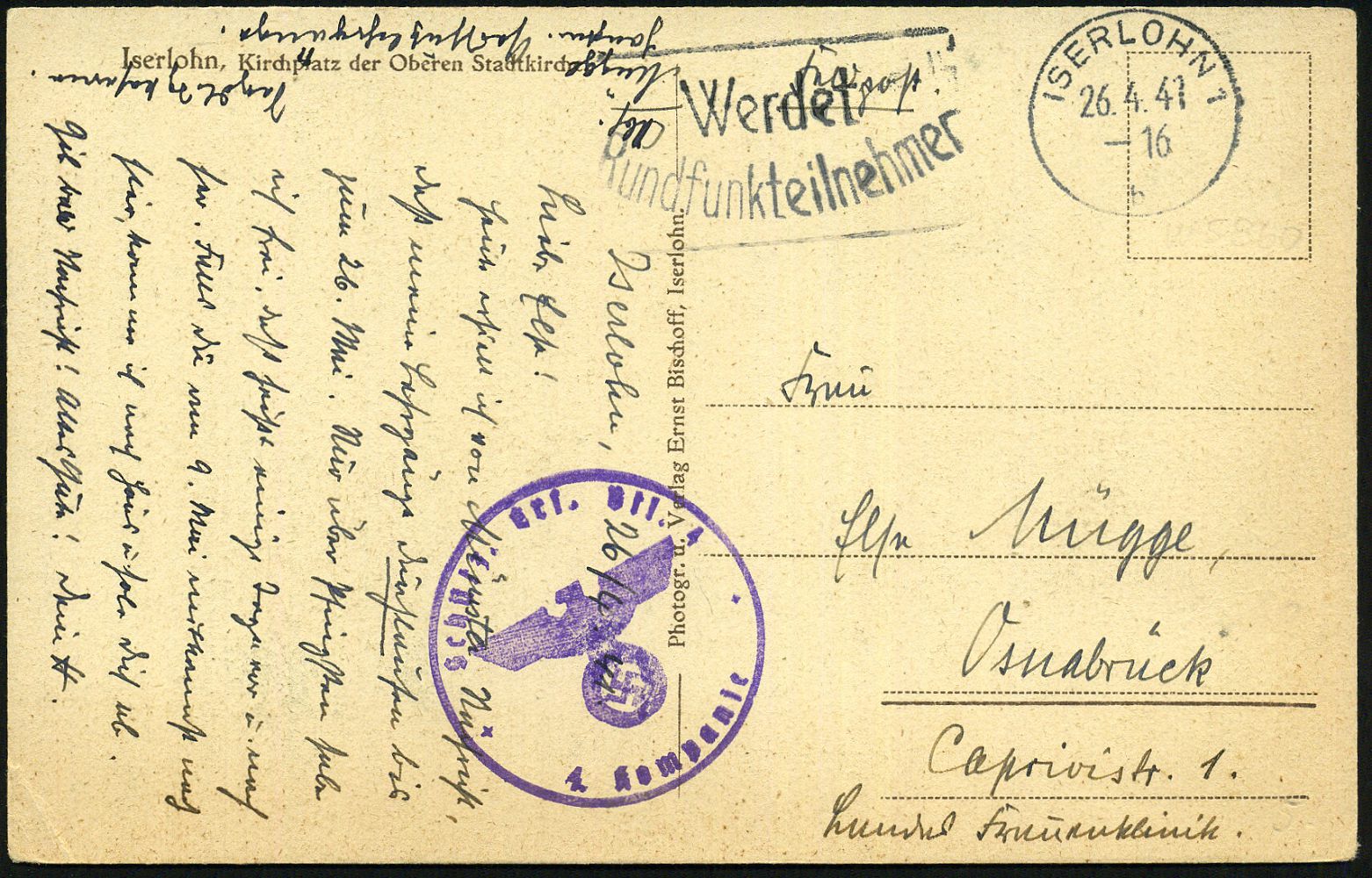 10833 | 16 € | PL-Raum 58 : ISERLOHN 1/ b/ Werdet/ Rundfunkteilnehmer 1941 (26.4.) Serien-MWSt + viol. 1K-HdN: Schütz.(en) Ers. Btl. 4/4. Kompanie , klar gest. s/w.-Feldpost-Foto-Ak.: Kirchplatz Ob. Stadtkirche n. Osnabrück (Bo.S 104 A) | ![]() ![]() | |