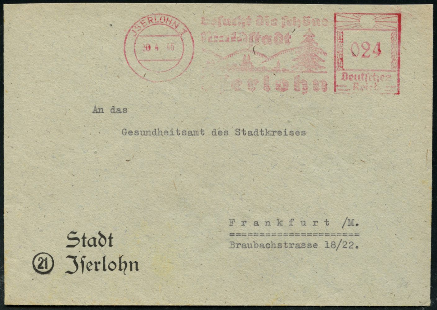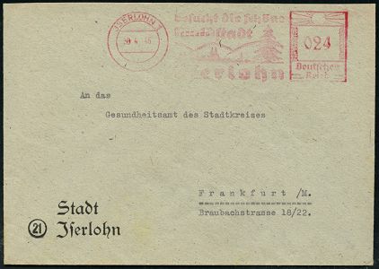 10835 | 23 € | PL-Raum 58 : JSERLOHN 1/ Besucht die schöne/ Waldstadt 1946 aptierter AFS Francotyp "Hakenkreuz" = entfernt = Notmaßnahme! (Tanne, Berge u. Ort) rs. viol. Abs.-2L: Stadtverwaltng Iserlohn.., kommunaler Fern-Bf. (Dü.E-12 D-97o) | ![]() ![]() | |