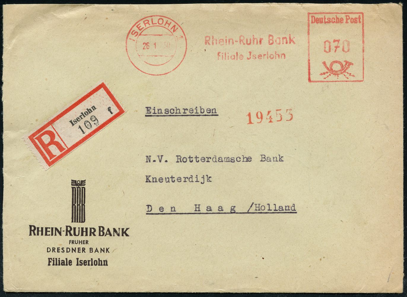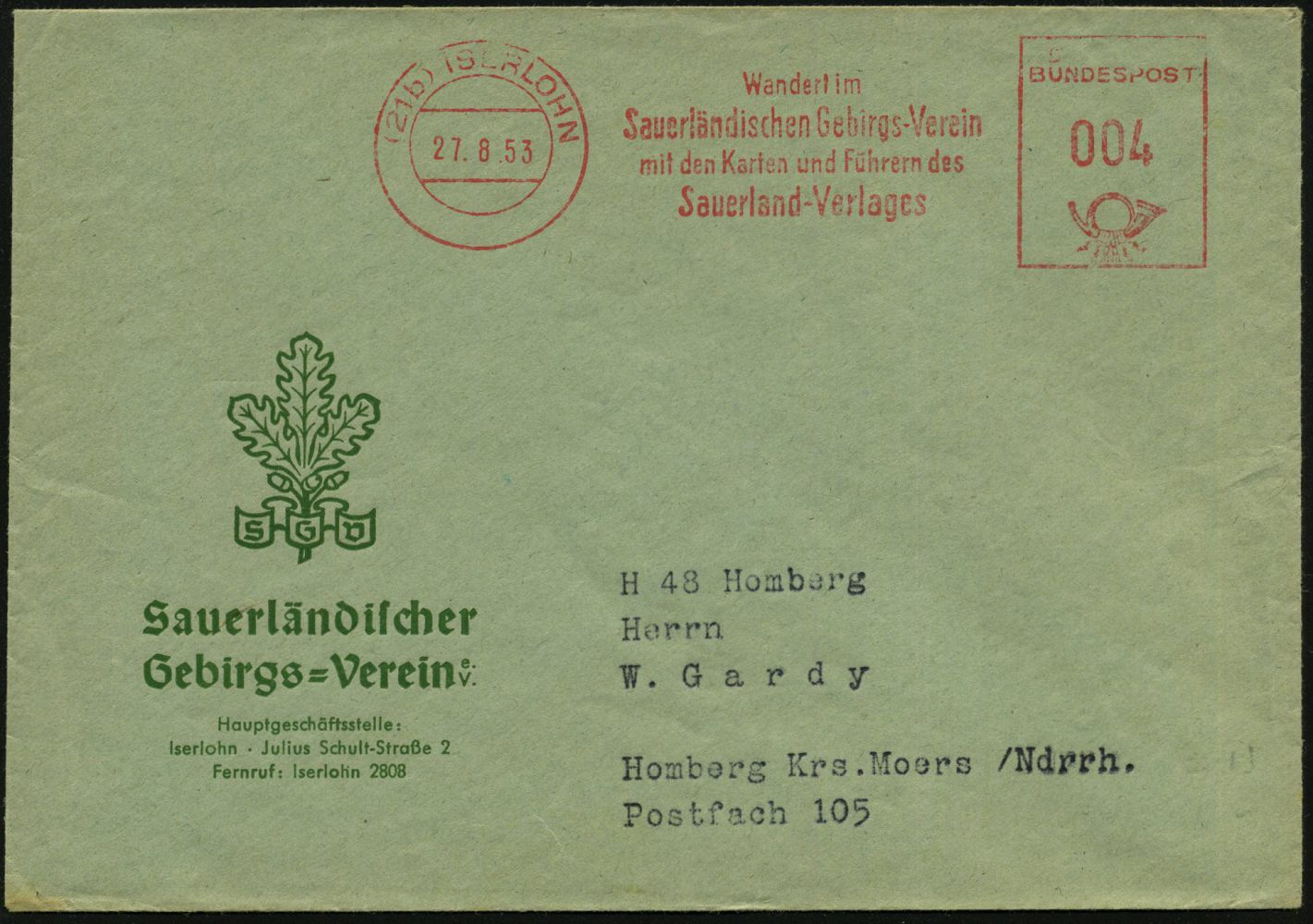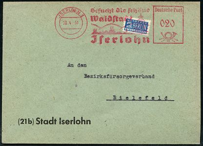 10837 | 18 € | PL-Raum 58 : ISERLOHN/ 100 Jahre../ KISSING & MÖLLMANN 1950 (5.4.) AFS Francotyp "Posthorn" (Lorbeer) auf 2 Pf. gez. NoB (= Vorausentwertung) rs. Abs.-Vordruck, klar gest. Fern-Bf. (Dü.E-20CGo) | ![]() | |