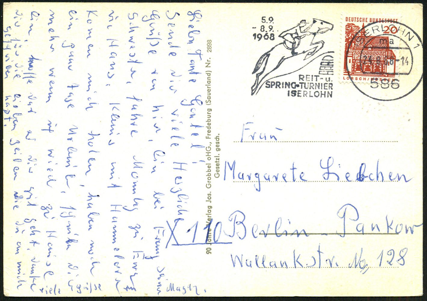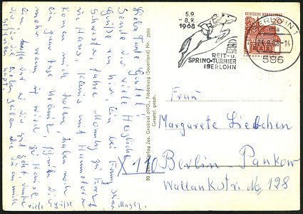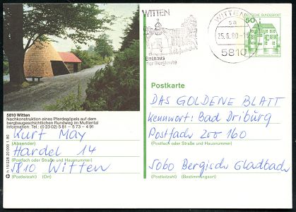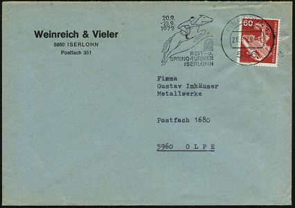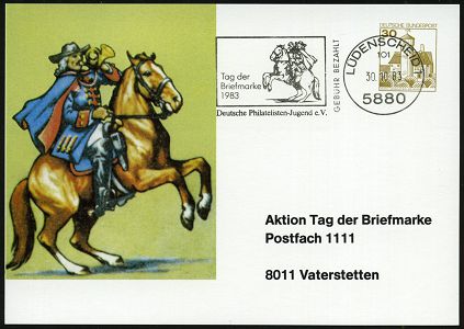 10892 | 10 € | PL-Raum 58 : 5880 LÜDENSCHEID 1/ 101/ GEBÜHR BEZAHLT/ Tag der/ Briefmarke.. 1983 (30.10.) Absenderstempel = Vorausentwertung, Motiv: Postreiter auf motivgl. PP 30 Pf. Burgen: Aktion Tag der Briefmarke mit gedruckter Adresse (Mi.PP 147/1) | ![]() | |