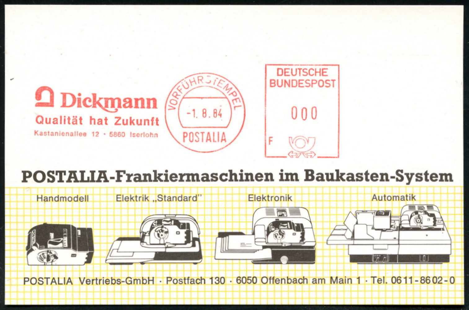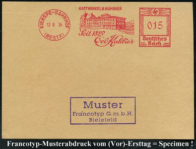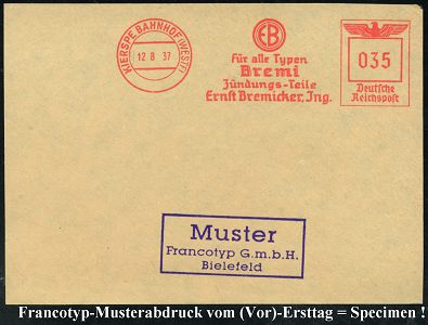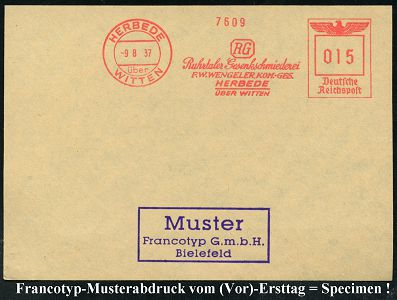 10779 | 35 € | PL-Raum 58 : HERBEDE/ über/ WITTEN/ RG/ Ruhrtaler Gesenkschmiederei/ F.W.WENGELER.. 1937 (9.8.) AFS-Musterabdruck Francotyp "Reichsadler" = PSt. I-Typ (Monogr.-Logo) glasklar gest. Francotyp-Musterblatt vom (Vor)-Ersttag !, selten!, vergl. Kat.-Nr. 10781 (Dü.E-5CGh) | ![]() ![]() | |