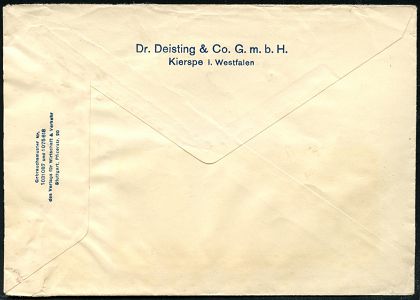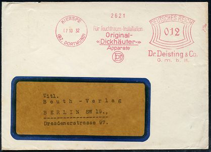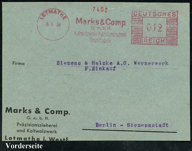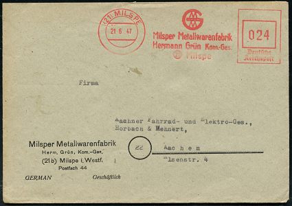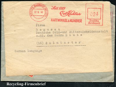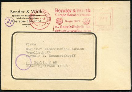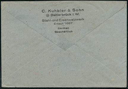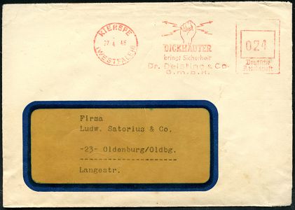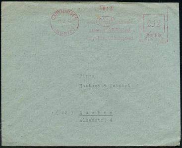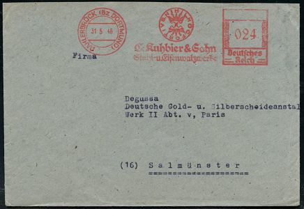 10754 | 30 € | PL-Raum 58 : DAHLERBRÜCK (Bz DORTMUND)/ NIHIL HOC FORTIVS/ E.Kuhbier & Sohn/ Stahl-u.Eisenwalzwerke 1946 (31.5.) seltener, aptierter AFS Francotyp "Hakenkreuz" = entfernt = Notmaßnahme! (Firmenlogo m. latein. Sinnspruch "NIL HOC FORTIUS") rs. Abs.-Vordruck: (Dü.E-12 K-98o) | ![]() ![]() | |