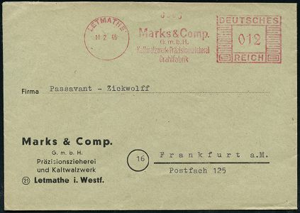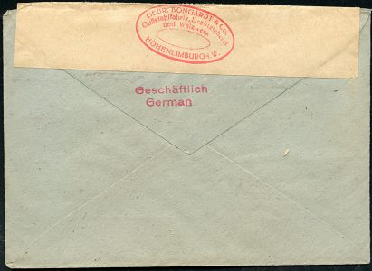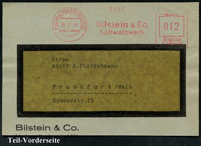 10814 | 12 € | PL-Raum 58 : HOHENLIMBURG/ Bilstein & Co./ Kaltwalzwerk 1940 (24.2.) AFS Francotyp "Reichsadler" auf Teil-Vorderseite (Dü.E-5CGh) | ![]() | |