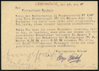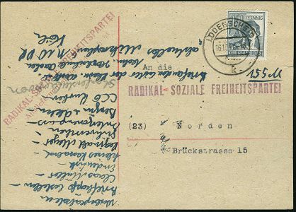 10884 | 30 € | PL-Raum 58 : LÜDENSCHEID/ k 1947 (16.10.) 2K-Steg + viol. Abs.-2L: RADIKAL-SOZIALE FREIHEITSPARTEI.. , Inl.-Kt. mit Parteibezügl. Text! = RSF, 1946 in Düsseldf. gegr. ab 1950 FSU, Programm: Abschaffung des Grundeigentums, Grundrente für Mütter, Rückzug des Staates aus Ehe u. persönl. Angelegenheite, Abbau nationaler Grenzen etc.,seltener Beleg der Zeitgeschichte (Mi.947) | ![]() ![]() | |