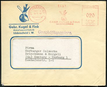 10886 | 18 € | PL-Raum 58 : (21b) LÜDENSCHEID/ GEBR.KUGEL & FINK 1948 (19.11.) AFS Francotyp "Posthorn" (Firmenlogo: Elster mit Löffel auf Kugel) auf. motivgl. Firmen-Bf.: Gebr. Kugel & Fink, Metallwarenfabrik (E-20CEh) | ![]() | |