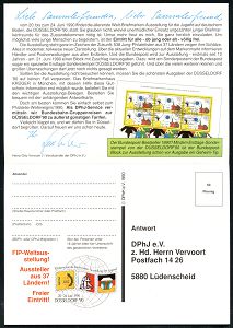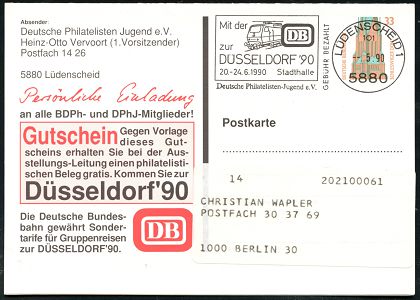 10898 | 8 € | PL-Raum 58 : 5880 LÜDENSCHEID 1/ 101/ GEBÜHR BEZAHLT/ Mit der DB/ zur/ DÜSSELDORF´90 1990 (Mai) Absenderstempel (E-Lok) = Vorausentwertung auf passender PP 33 Pf. Bauwerke "Düsseldorf ´90" + anhängender Antwort-Klappkarte (ungebr. anhängend!) Bedarfs-Kt. (Mi.PP 162) | ![]() ![]() | |