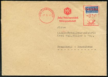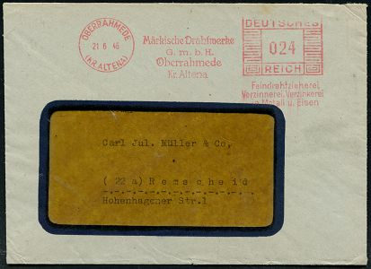 10913 | 25 € | PL-Raum 58 : OBERRAHMEDE/ (KR.ALTENA)/ Märkische Drahtwerke/ G.m.b.H./ ..Feindrahtzieherei/ Verzinnerei,Verzinkerei.. 1946 (21.6.) AFS Francotyp "Mäanderrechteck" u n v e r ä n d e r t weiterverwendet = Notmaßnahme! , klar gest. Fern-Bf., vergl. Kat.-Nr. 10910 (Dü.E-2CGo unverändert) | ![]() | |