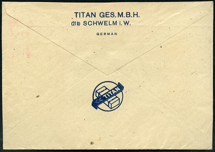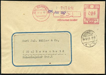 10936 | 25 € | PL-Raum 58 : (21b) SCHWELM/ TITAN/ millionenfach bewährt 1947 (27.6.) aptierter AFS "Hakenkreuz" = entfernt = Notmaßnahme !+ 1K-Brücke: SCHWELM/*c* vom 28.6. = Datums-Korrektur , rs. Abs.-Vordr. u. Reklame. TITAN GMBH (gegr. 1928, Fabrik für Verpackungs-Stahlbänder), Fern-Bf. (Dü.E-12 D-98o = seltene Type) | ![]() ![]() | |