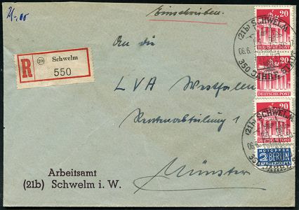 10937 | 18 € | PL-Raum 58 : (21b) SCHWELM/ 350 JAHRE STADT 1950 (6.6.) HWSt (Christus-Kirche) 2x auf 3x 20 Pf. Bauten, eng gez. (Mi.80 eg, MeF) + 2 Pf. NoB + RZ: (21b) Schwelm, Dienst-Fern-R-Bf.: Arbeitsamt.., rs. AS. (Bo.2, nur 1950 verwendet) | ![]() | |