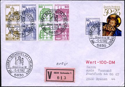 10943 | 18 € | PL-Raum 58 : 5830 SCHWELM 1/ 300 JAHRE ST.MARIEN/ Gemeindetag´82 1982 (5.6.) SSt = Marien-Skulptur mit Jesuskind 4x auf 50 + 25 Pf. "Weihnachten" Jesuskind u.a. (Mi.989 u.a.) 4x + rosa V-Zettel: 5830 Schwelm 1, Inl.-Wert-Bf. 100.- DM, seltene Verwendung! (rs. AS.) | ![]() | |