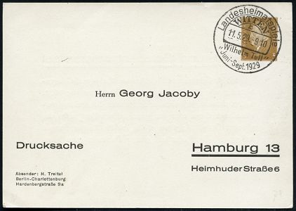 10961 | 28 € | PL-Raum 58 : WITTEN/ b/ Landesheimatspiele/ "Wilhelm Tell"/ Juni-Sept. 1929 (11.5.) HWSt auf PP 3 Pf. Ebert, braun: Georg Jacoby, Hamburg 13.. (Mi.PP 106/B 10) klar gest. Inl.-Karte (Bo.7 b) | ![]() | |