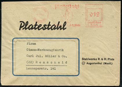 10747 | 25 € | PL-Raum 58 : AUGUSTENTHAL/ (Kr.ALTENA)/ Platestahl/ Stahlwerke R. & H.Plate 1945 (6.11.) aptierter AFS Francotyp "Hakenkreuz" = entfernt = Notmaßnahme! (Firmenlogo: Männerfigur) zweitbedingt teils etw. undeutl., rs. viol. Abs.-4L, Fern-Bf. (Dü.E-12 K-91o = seltene Type!) | ![]() ![]() | |